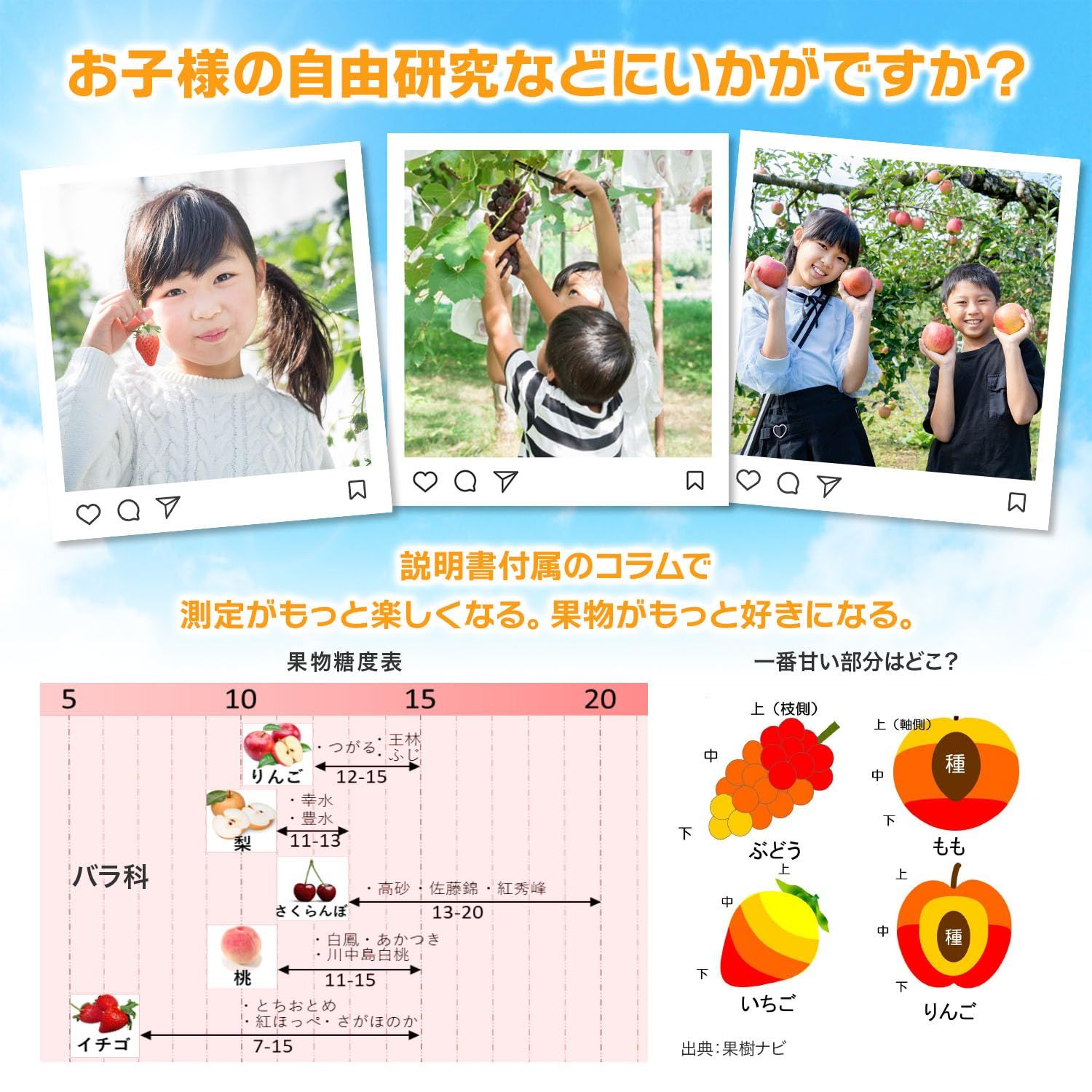 【くだもの専用】 果物・フルーツのために設計された糖度計だから、糖度の高いブドウやバナナも含めすべての果物の糖度が測れます!校正液付属&温度の影響を抑える温度補償機能ATCにより高精度に測定が可能です。