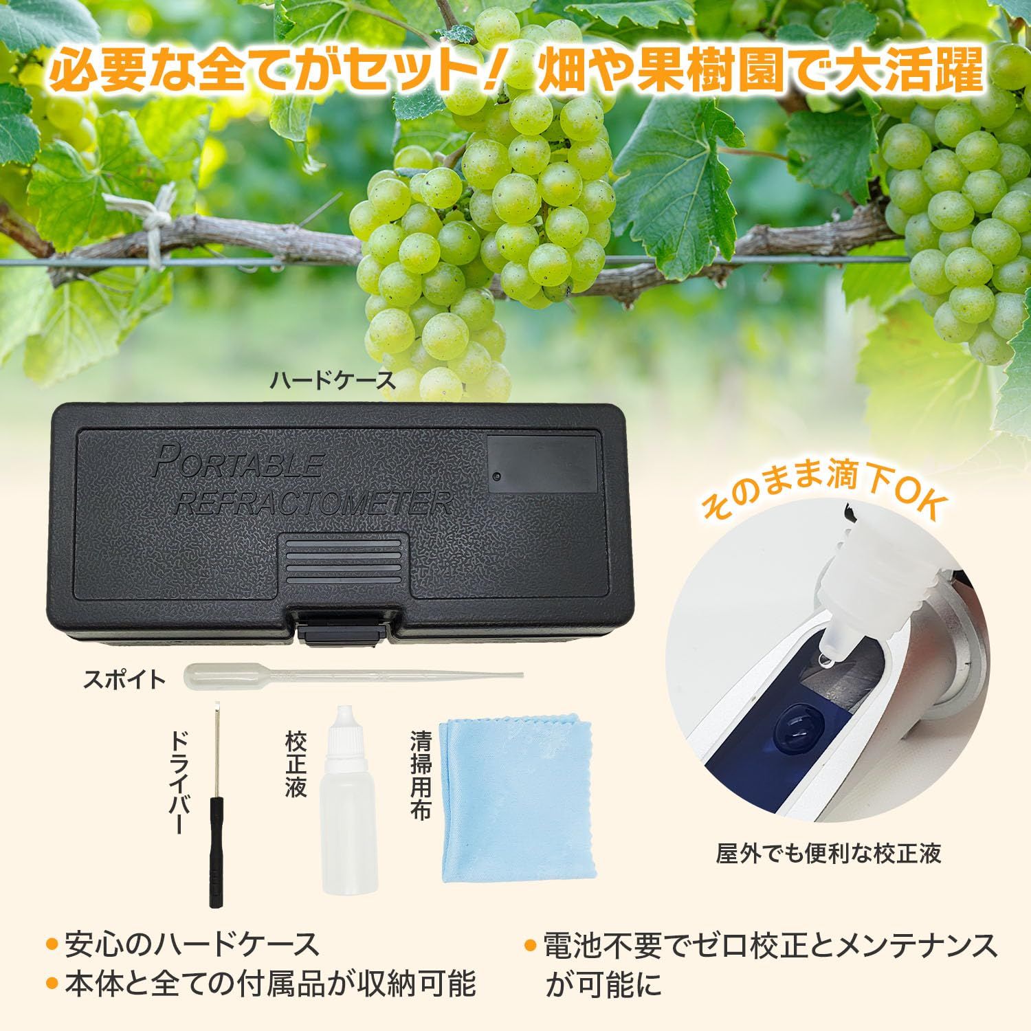【畑や果樹園でも活躍】 校正液(蒸留水)やふき取り用布、スポイトが付属しているので、屋外でもゼロ校正・メンテナンスが可能!(1)アルミ製の軽量設計、(2)単純構造で壊れにくい、(3)専用のハードケースが付きで安心して持ち運びできます。