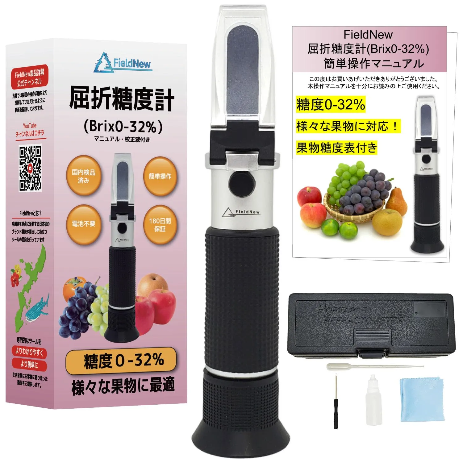 新品 FieldNew 糖度計(0-32%)【果物専用】 国内ブランド 日本語説明書・校正液付き 180日 国内品質検査済 温度自動補正 電池不要 屈折計 ブドウ フルーツ