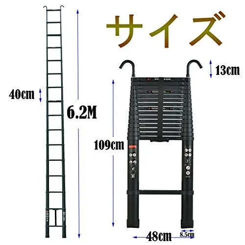 【サイズ】全長:6.2m*0.48m。収納時:1.09*0.48m。重量:約16.3kg,安全設計により耐荷重150kgを実現!階段数量:15段, 用途に合わせて必要な高さに調整可能。