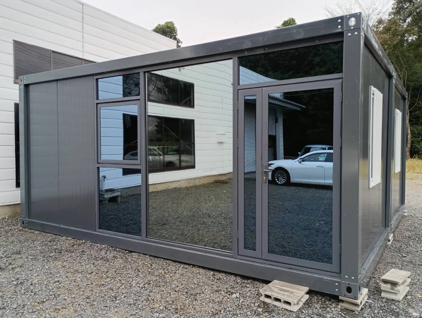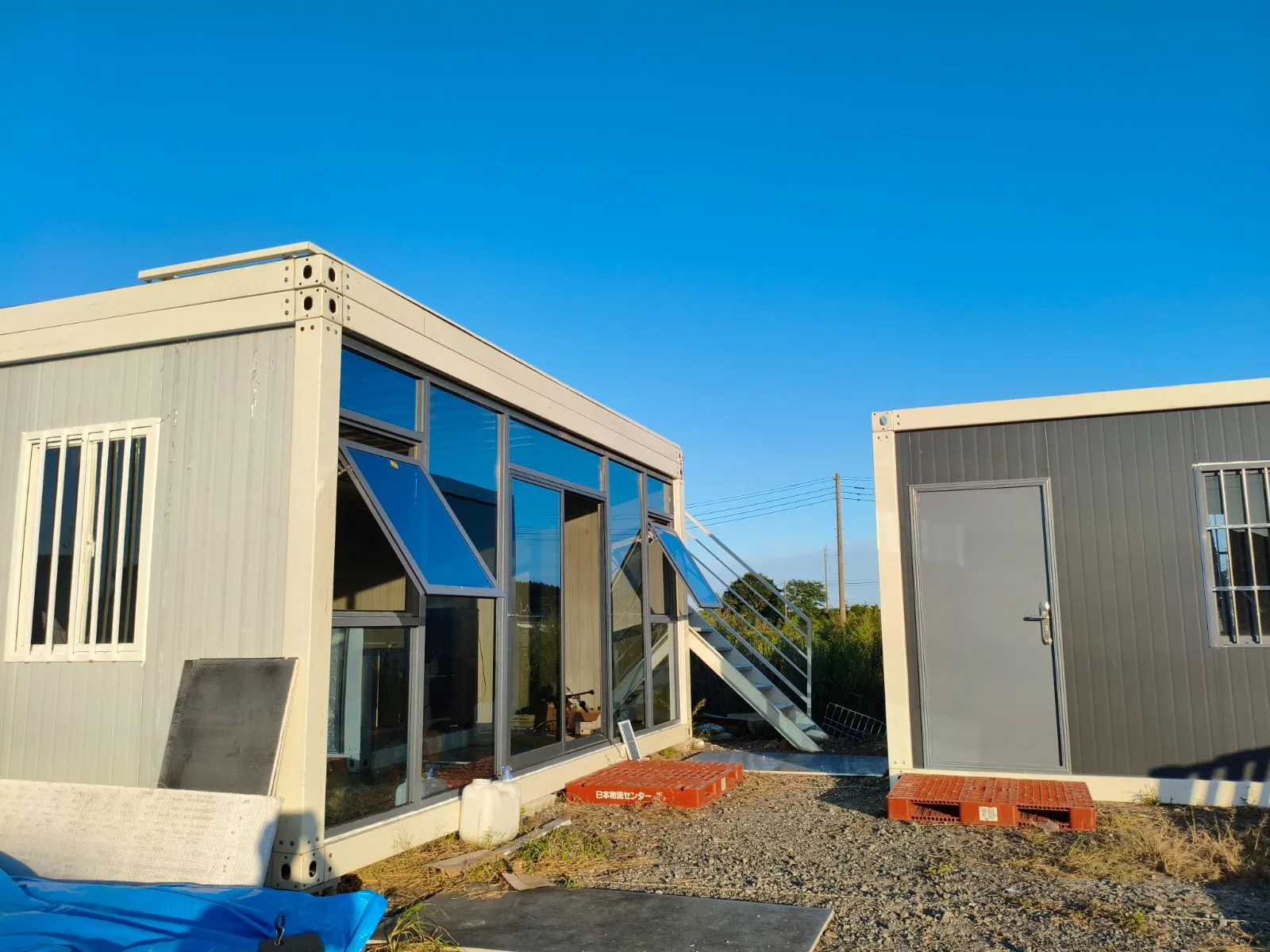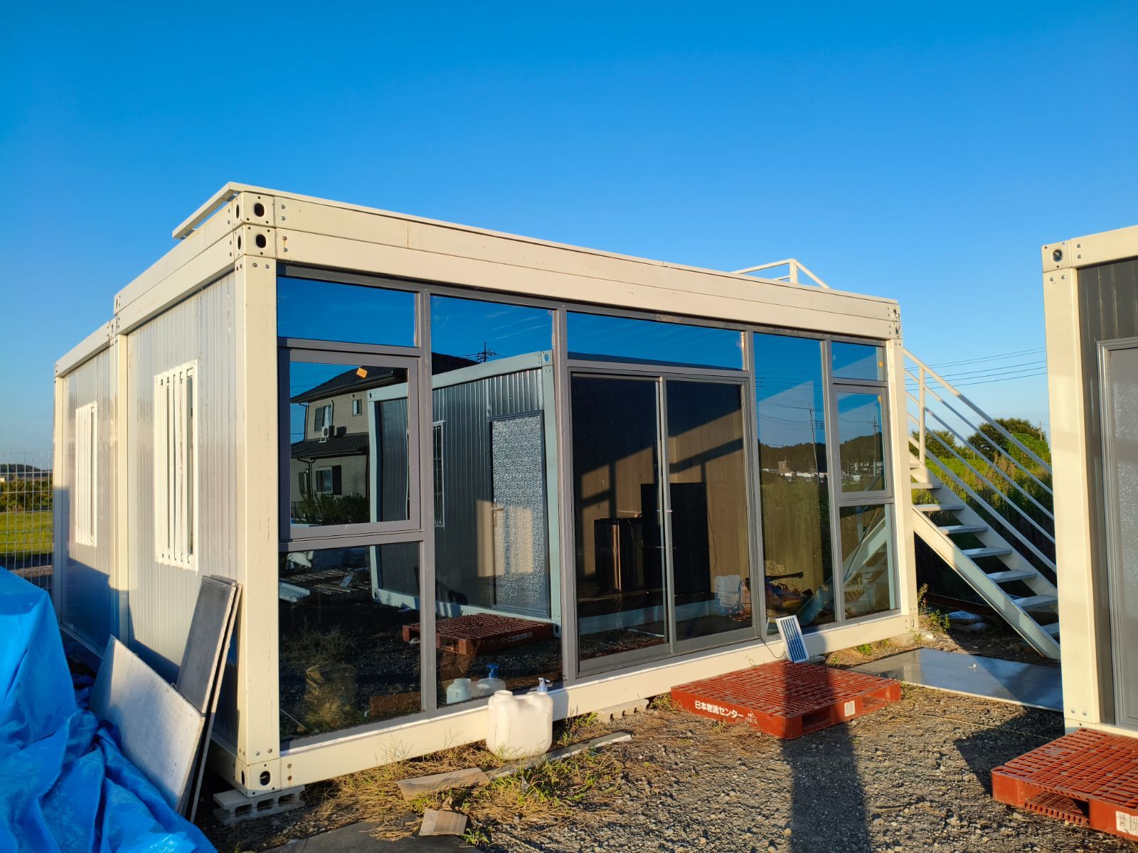 施工事例。オーダーメイド対応。2棟連結タイプ プレハブ住宅 二重強化ガラスウォールタイプ