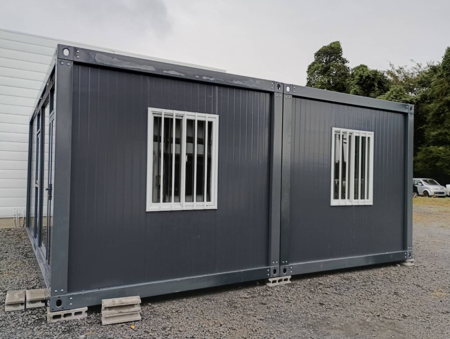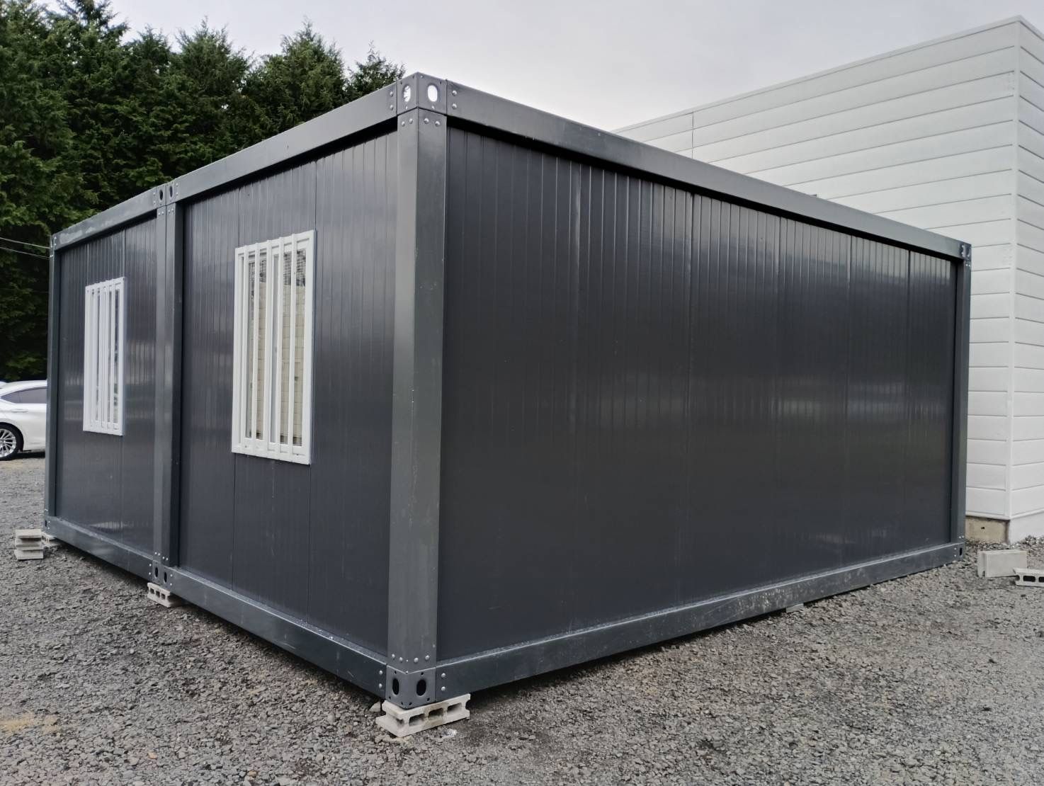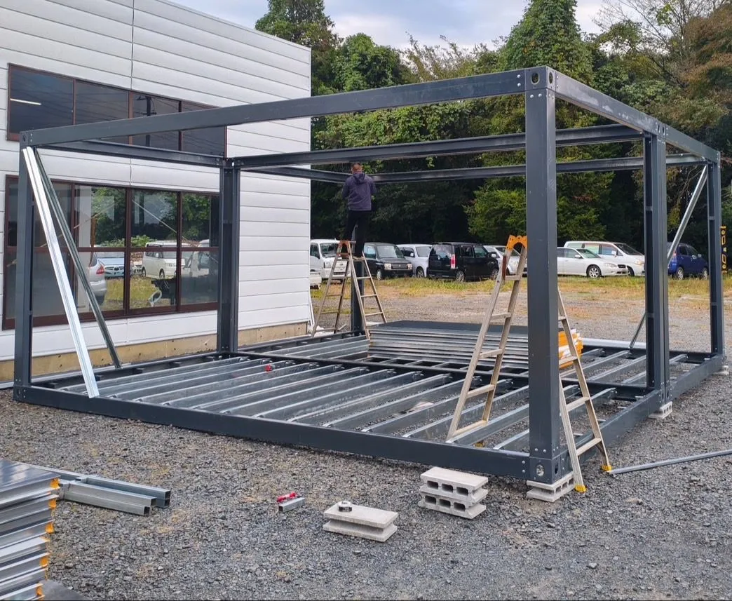 施工事例。オーダーメイド対応。2棟連結タイプ プレハブ住宅 二重強化ガラスウォールタイプ