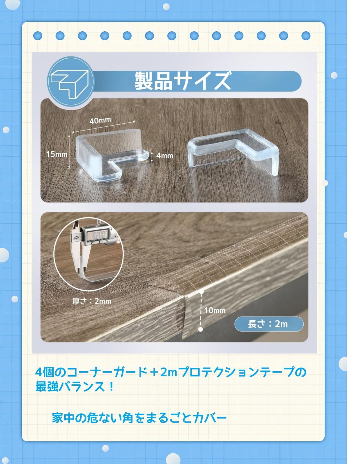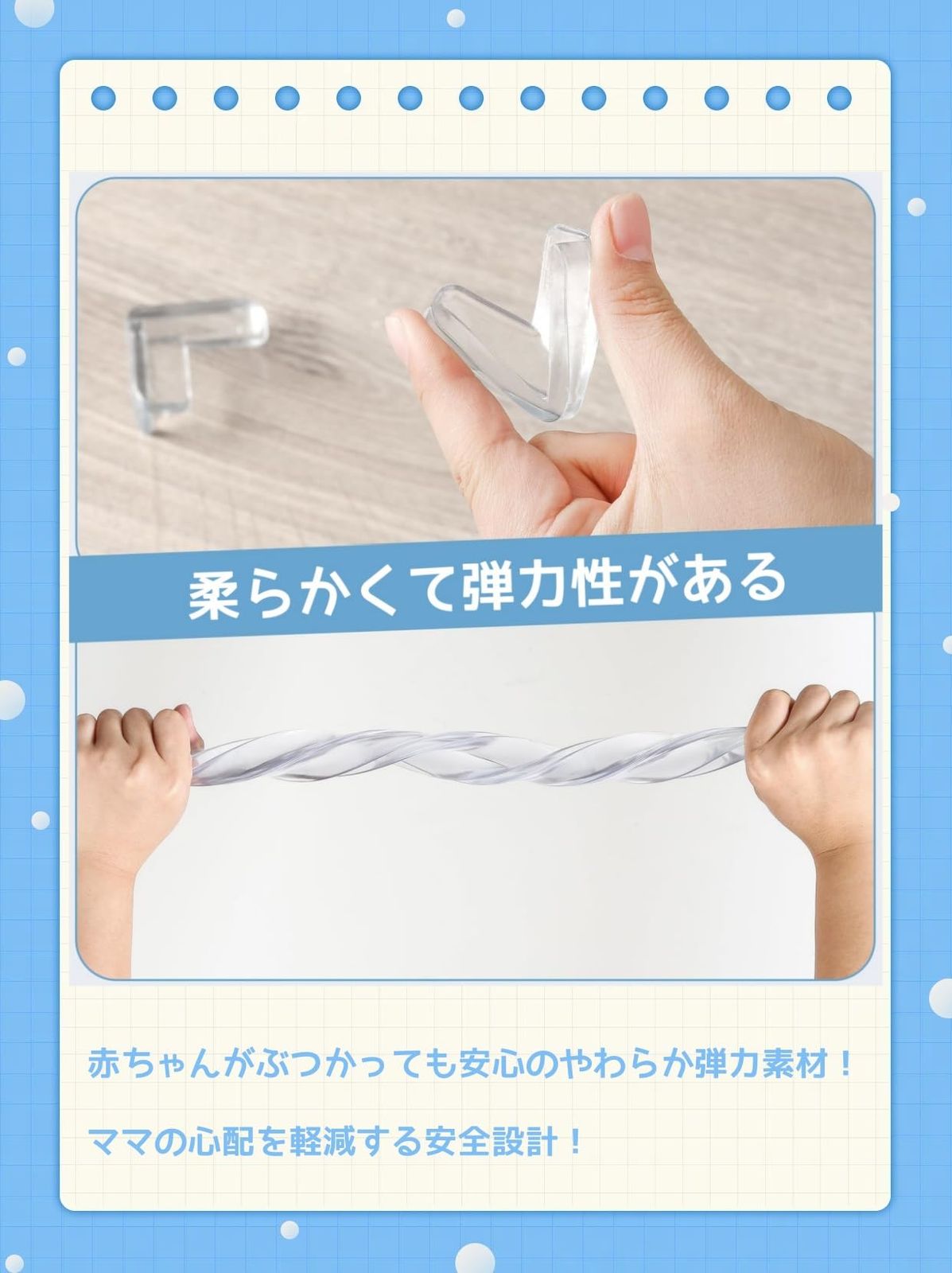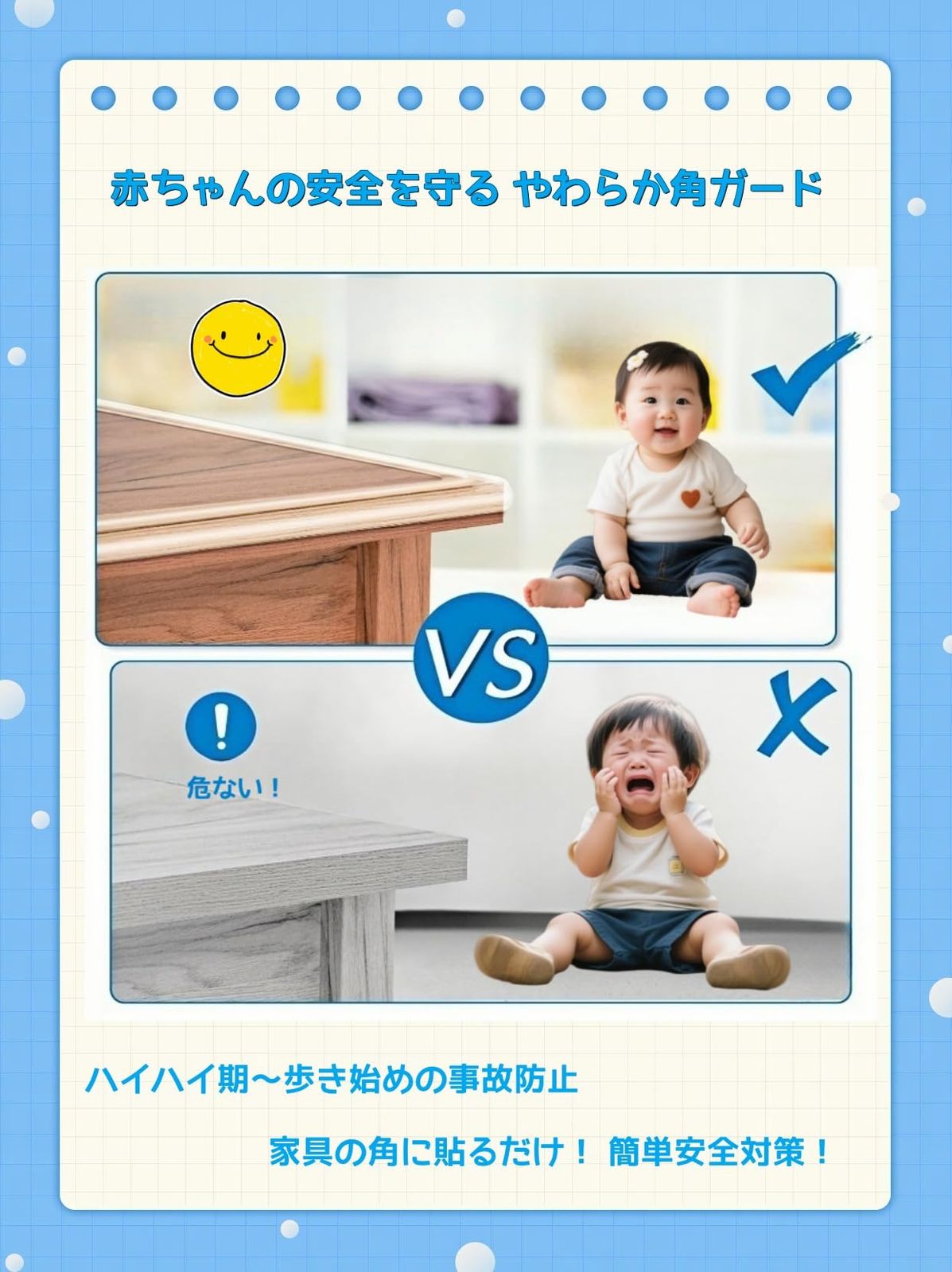 【安心のソフト素材】 やわらかく弾力性のある素材で、赤ちゃんが触れても安全。 赤ちゃんの安全を守る透明コーナーガード! 当社の透明な机角カバーは、赤ちゃんやお子様のぶつかり防止に最適な柔らかいクッション素材で作られています。壁の角・丸テーブル・L字テーブル・コーナー棚など、家中の鋭い角に簡単に取り付け可能。目立たない透明デザインでインテリアを損なわず、しっかり保護します。 柔らかクッション素材:衝撃を吸収し、赤ちゃんの転倒時のケガを軽減。 透明で目立たない:白・木目・カラフルな壁にも自然に溶け込みます。 簡単取り付け:粘着テープで剥がすのも簡単、傷つきにくい設計。 多用途対応:机・家具・ドア・赤ちゃんサークルなど幅広く適用可能。 最後までご確認頂き誠にありがとうございました。 上記をご確認頂き、ご購入いただけましたら幸いです。 何かご不明な点がございましたらお気軽にメッセージからお問い合わせ下さい。
