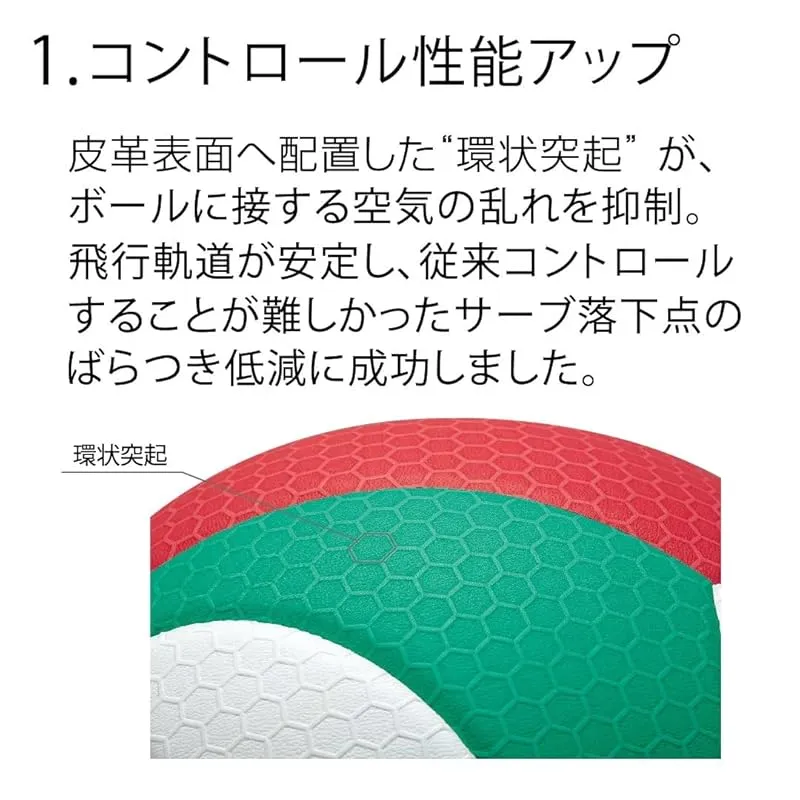【商品概要】 円周/62~64cm 1.コントロール性能がアップ ボールに接する空気の乱れを抑制、従来コントロールするのが難しかったサーブ落下点のばらつきを低減します。 2.ボールの感触が柔らかくなり、レシーブの正確性アップにつながります。 3.従来の6面フレームを継承しながら、フレーム内に流線型パネルを配置する事でボールの回転がさらになめらかに見えるようになり視認性をアップさせます。 貼り・人工皮革4号球(軽量)
