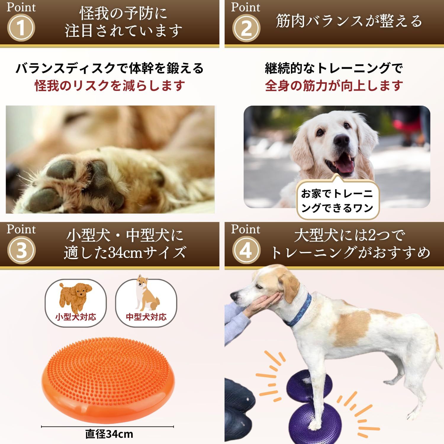【円形タイプのバランスディスク】 円形のバランスディスクは、四方に均等に力がかかるため安定感があります。これにより、トレーニング初心者のワンちゃんでも安心して使用できます。特に、バランスボールに比べて転倒のリスクが少ないため、どんなワンちゃんでも安全にトレーニングを始められます。