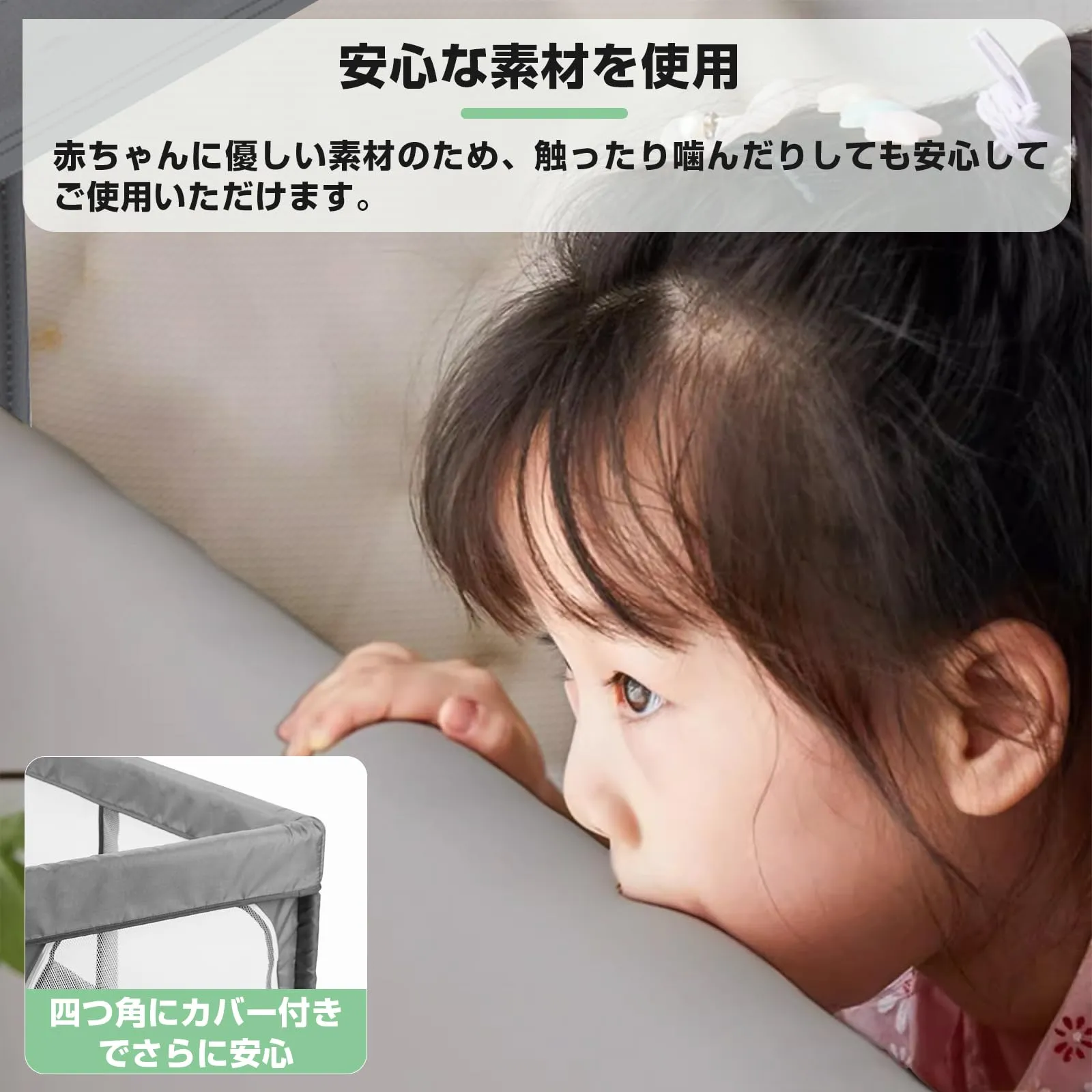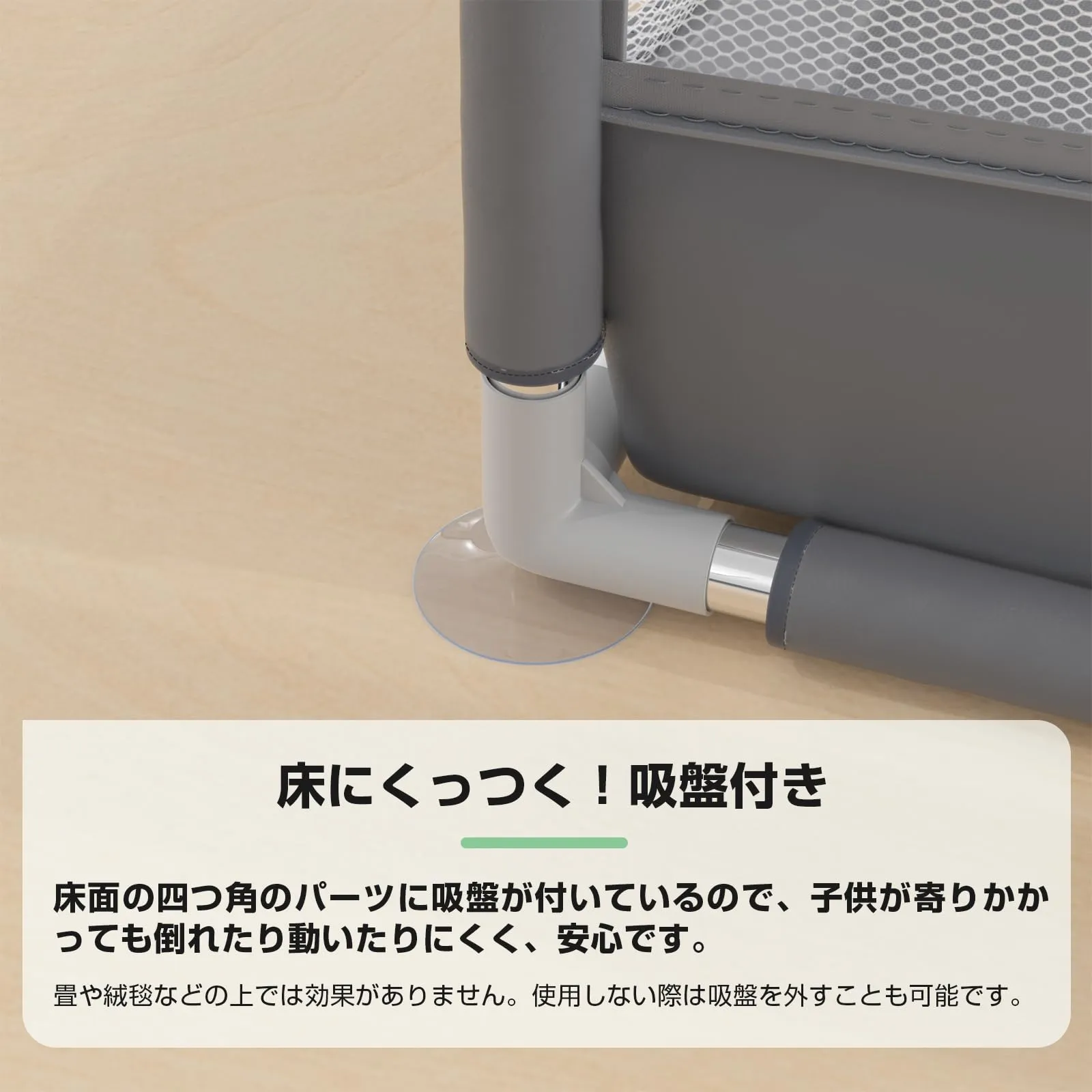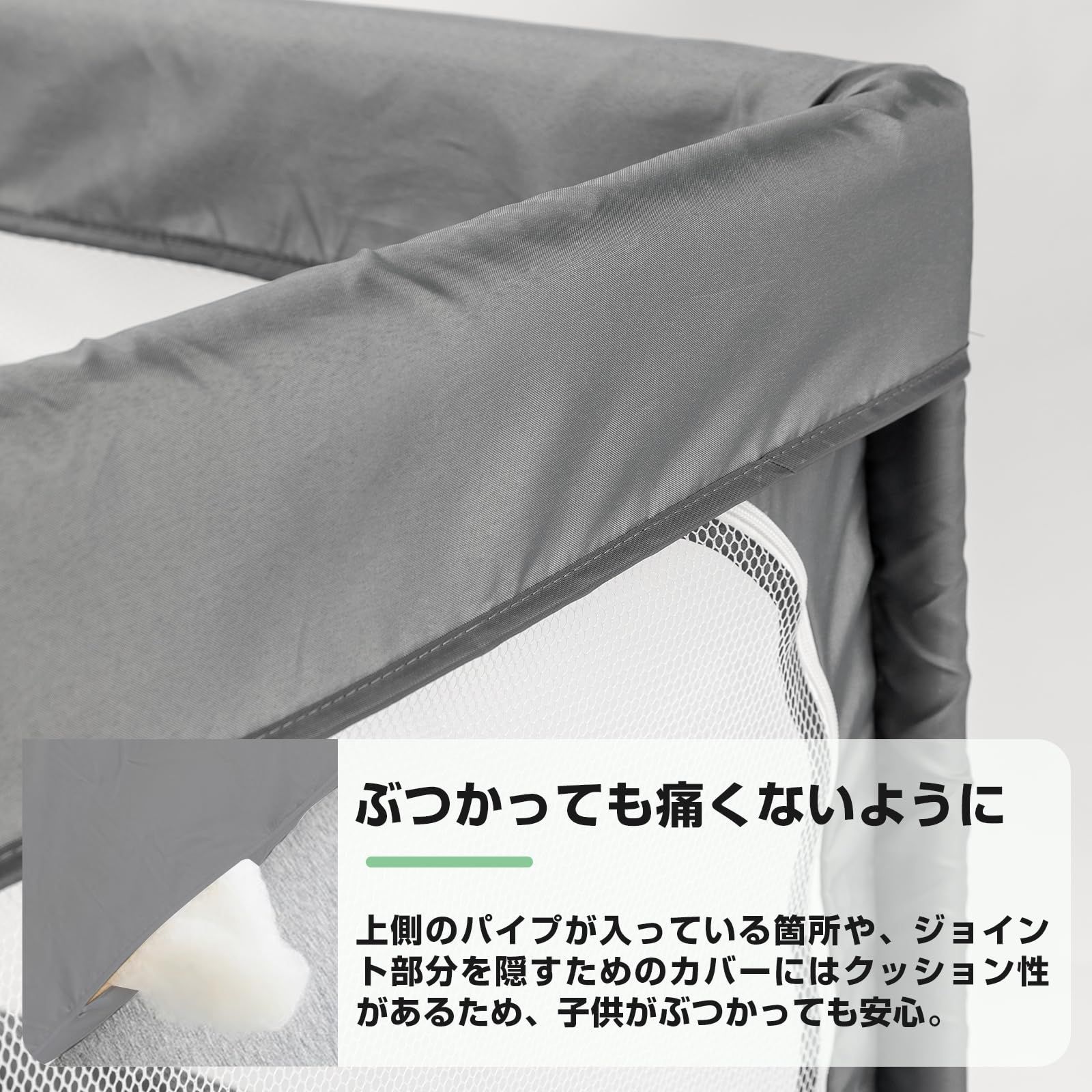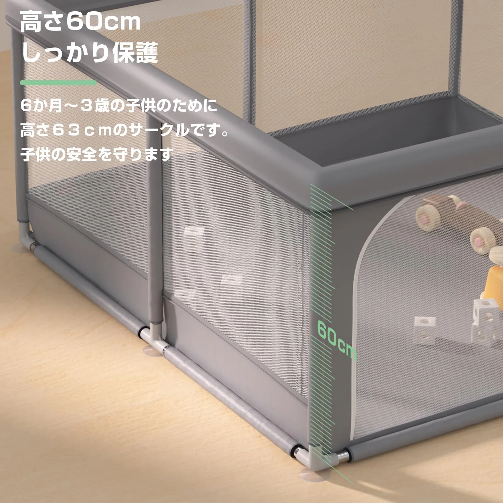 【安全設計】メッシュならではの通気性のよい素材で、閉塞感がなくお子様の遊ぶ姿を安心してみることができます。 また、上部/側面のパイプ部分はカバーがついているので、ぶつかってしまっても安心です。 四つ角には大きな吸盤がついているので、サークルの滑りを防ぎます。