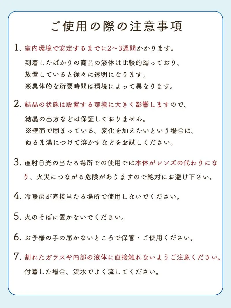 ◆素材 ガラス:硼珪酸ガラス/混合液:水、エタノール、天然樟脳、塩化アンモニウム、硝酸カリウム
