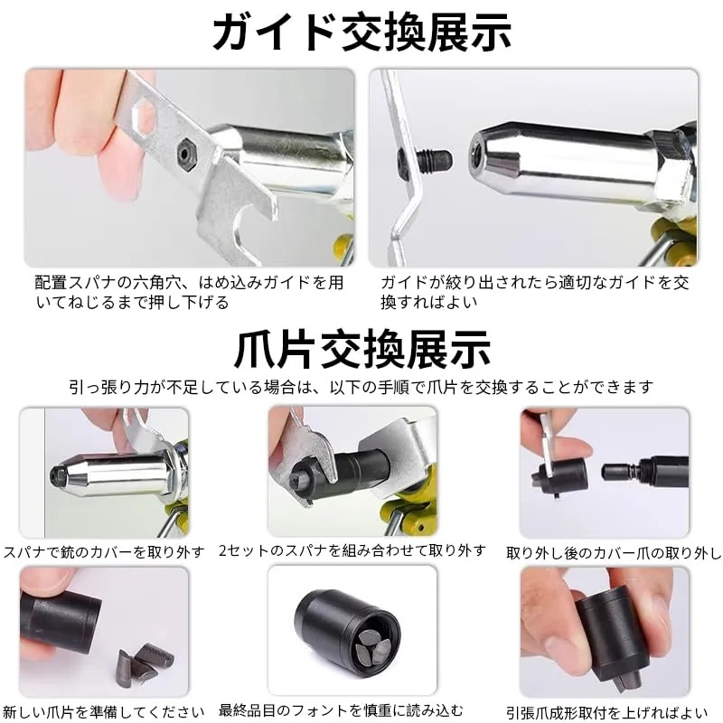 【DIYと加工用途】:これらの工具セットはDIY愛好家や加工作業者に非常に適しています。家庭の修繕から仕事のプロジェクトまで、リベットガンは便利なリベット接合の解決策を提供します。
