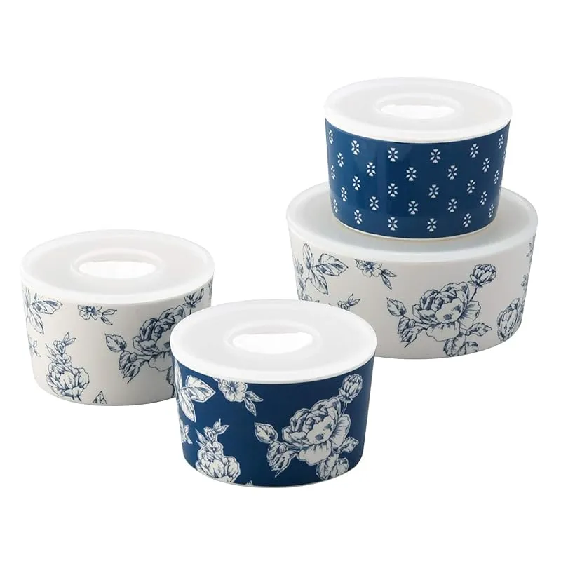 【迅速発送】ローラアシュレイ レンジパック 蓋付 ノンラップ 小鉢 サマーローズ (大 直径13cm×1 小 直径9.5cm×3) 4種 青 食器セット ふた付 保存容器 キャニスター タッパー おしゃれ 薔薇 花柄 プレゼント 女性 laura ashl 0