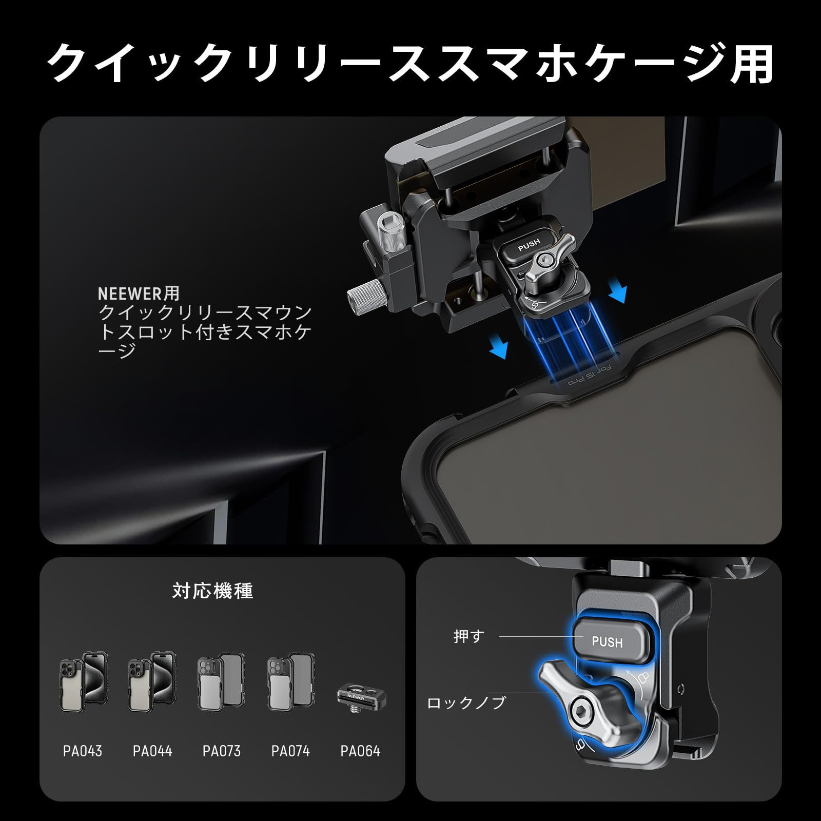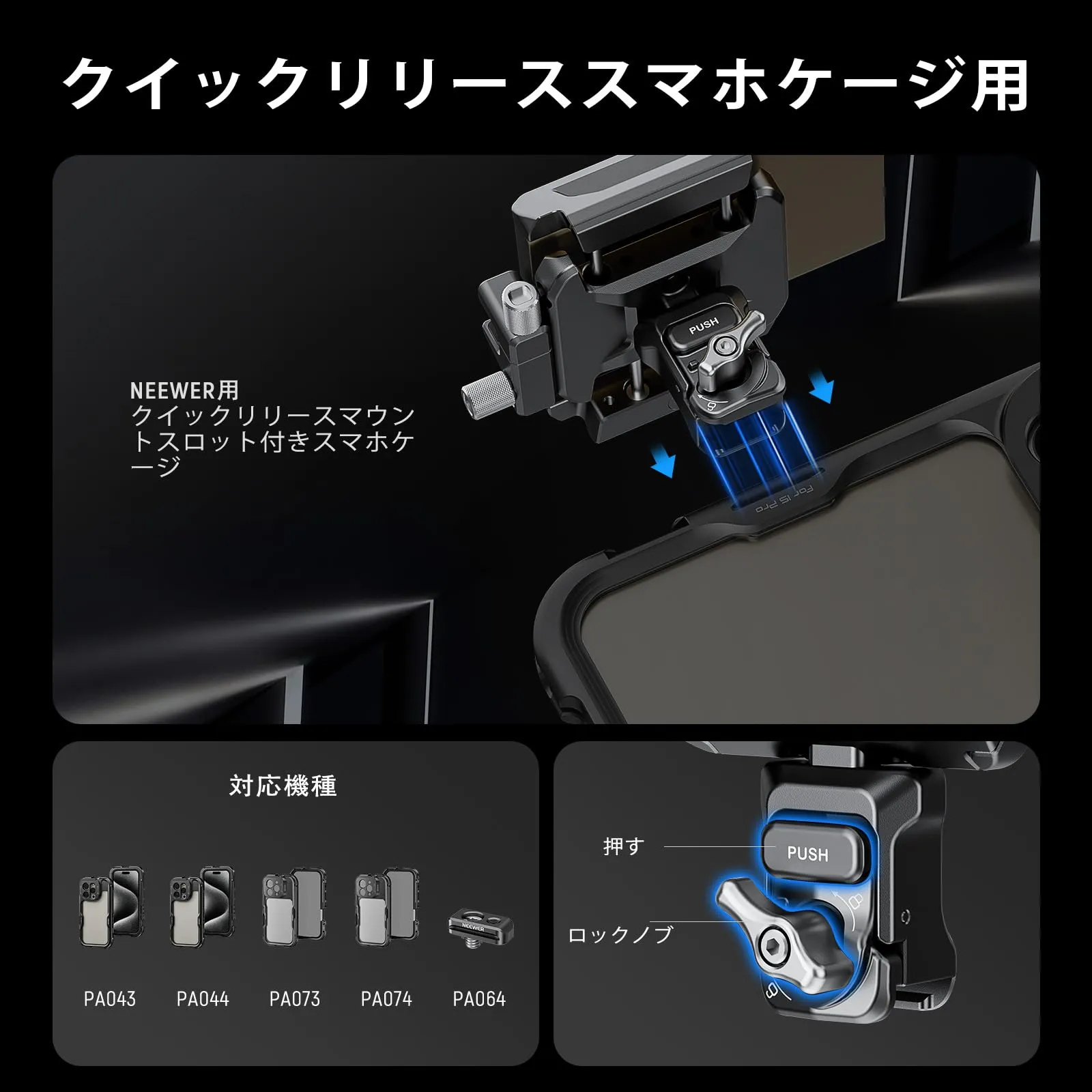 【クイックリリーススマホケージ用】クイックリリースマウントスロット付きNEEWERスマホケージアクセサリー用に設計され、コンパチブル iPhone 16 Pro/Pro Max用PA073/PA074、iPhone 15 Pro/Pro Max用PA043/PA044、Galaxy S24 Ultra用PA042など。ご注意:SmallRigクイックリリースマウントスロットには対応しません。
