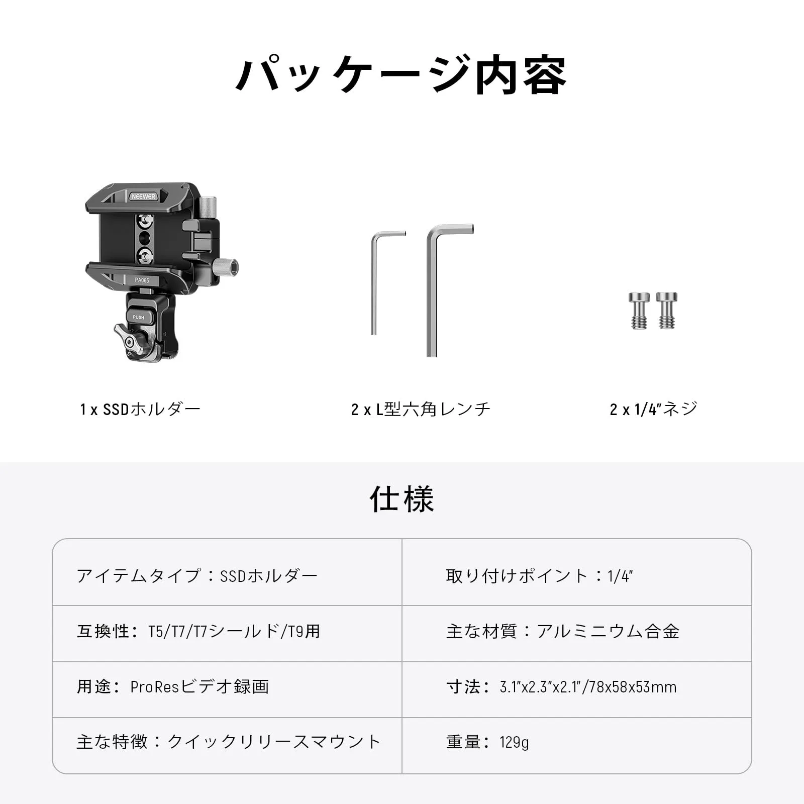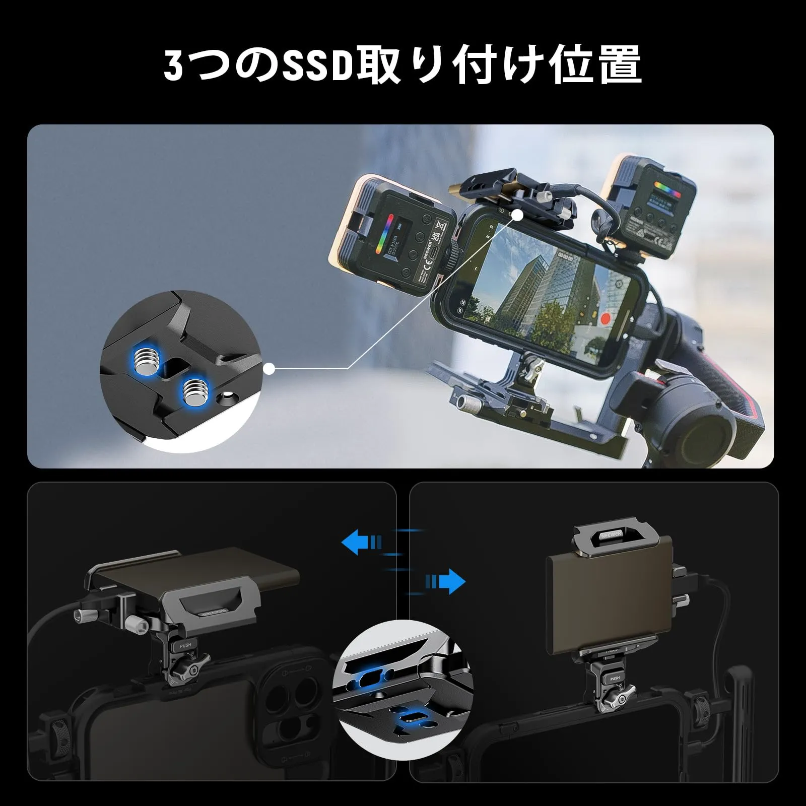 【3つのSSD取り付け位置】クイックリリースクランプは水平方向と垂直方向の取り付けに対応しています(垂直方向に取り付ける場合は、クイックリリースクランプを取り外し、SSDホルダーの側面に再度取り付けます)。付属1/4ネジ2本を使用し、SSDホルダーを汎用スマホケージ(NEEWER PA009/PA017)に取り付けます。コンパチブル SmallRigスマホケージ。