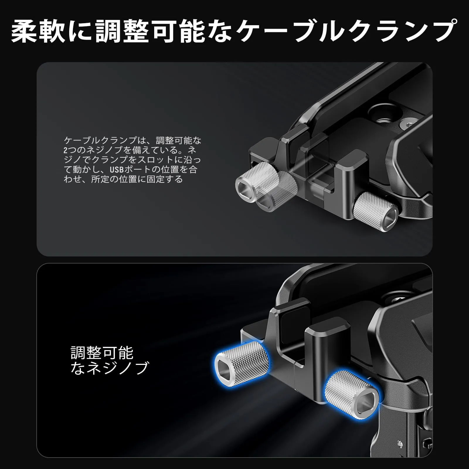 【柔軟に調整可能なケーブルクランプ】ケーブルクランプは、調整可能な2つのネジノブを備えています。ネジノブはスロットに沿い、クランプを移動させ、USBポートの位置合わせて所定の位置にロックします。もう一つのネジノブはケーブルを固定し、安定した信号転送できます。
