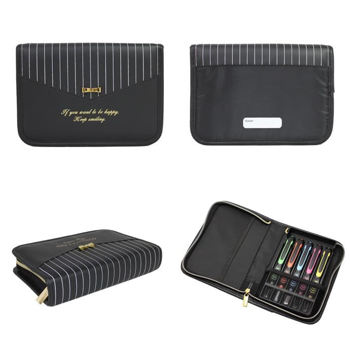 【収納バッグ】※保管時や配送時にリボンの金具が多少傾いてしまう場合がございます。輪の部分は接着されておりませんので、手で回してお直しいただけます。前面は合皮にゴールドのリボンが付けられており、高級感があります。全体的に黒で汚れが目立ちにくく、大人びたデザインです。