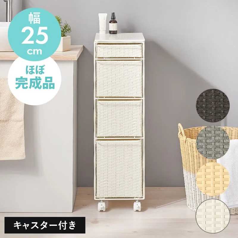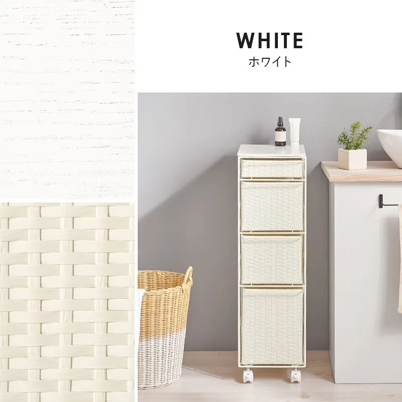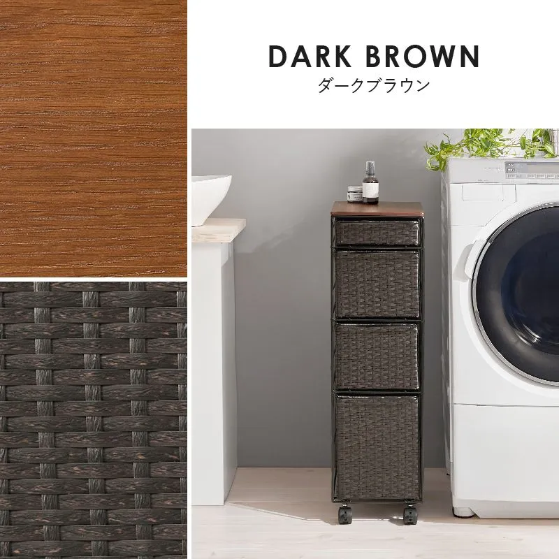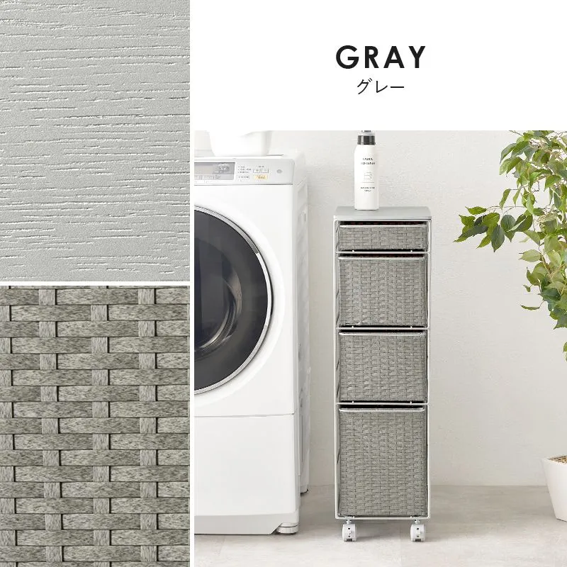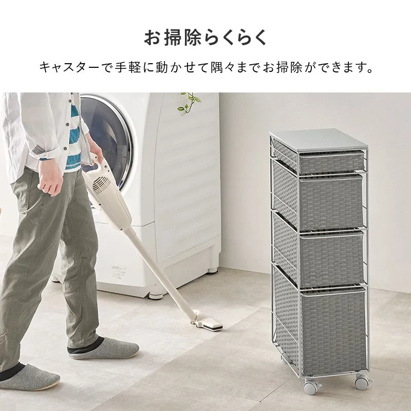 ランドリースペースやキッチンの隙間で使えるチェスト。樹脂素材を編んだ引出しは水や汚れに強く通気性も抜群。