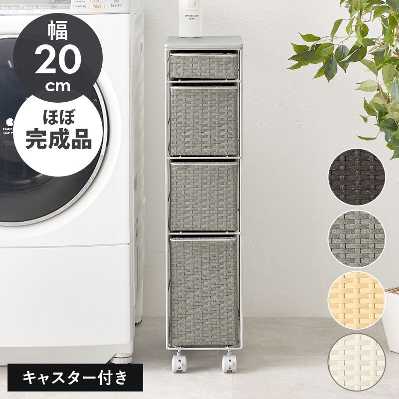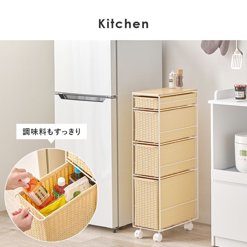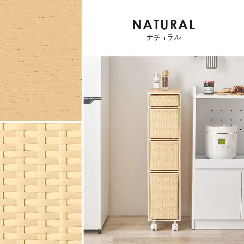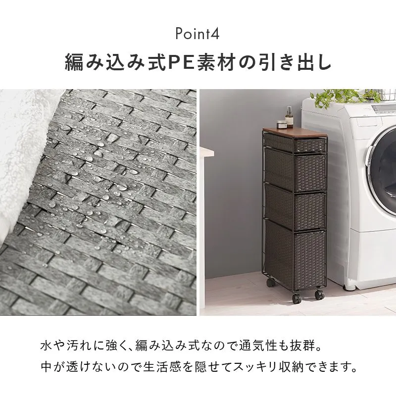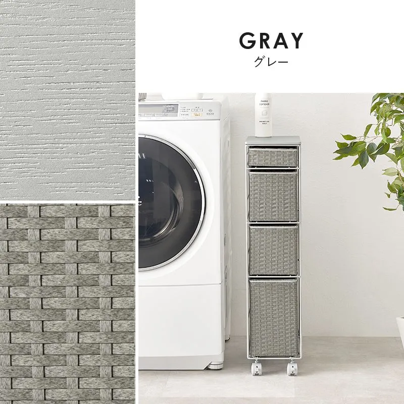 ランドリースペースやキッチンの隙間で使えるチェスト。樹脂素材を編んだ引出しは水や汚れに強く通気性も抜群。
