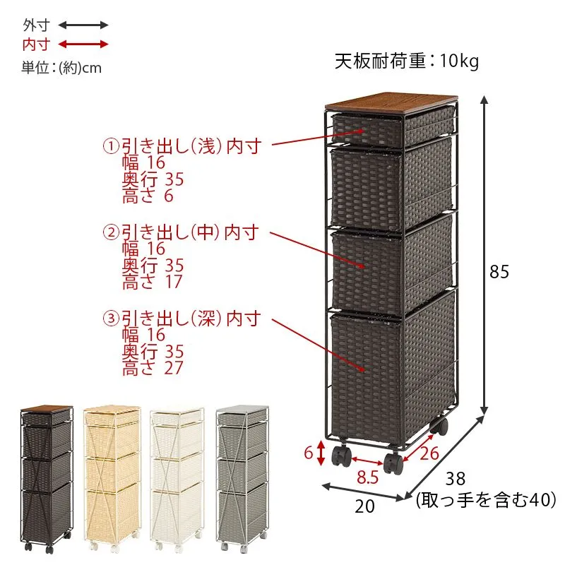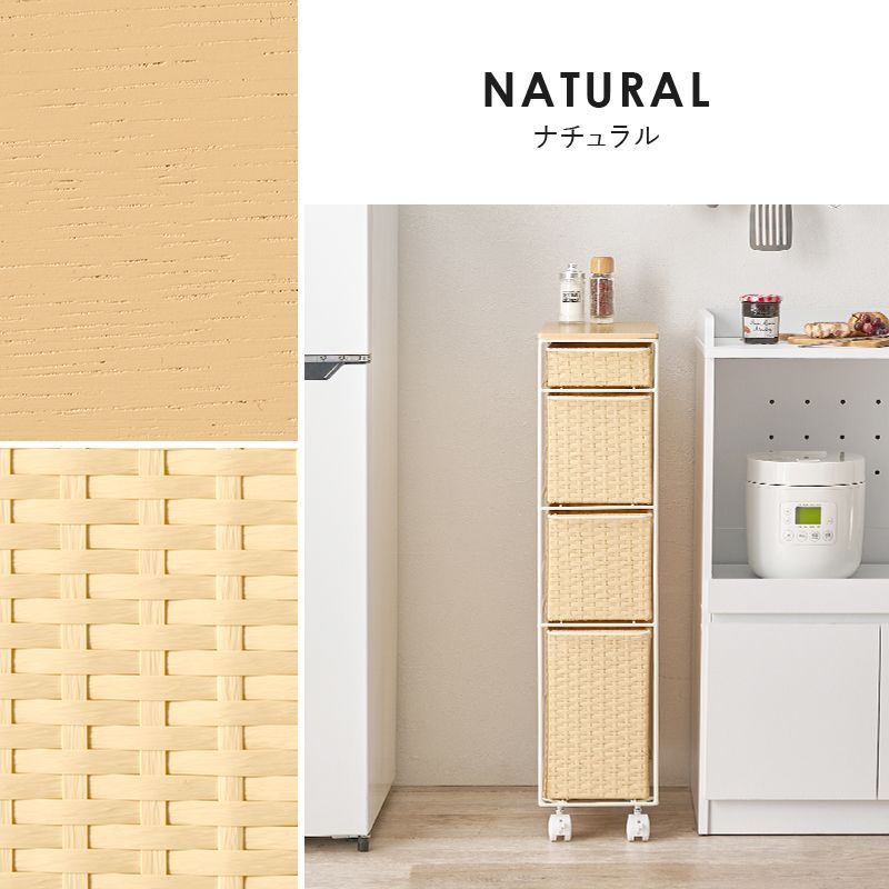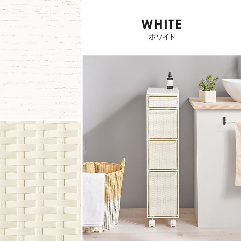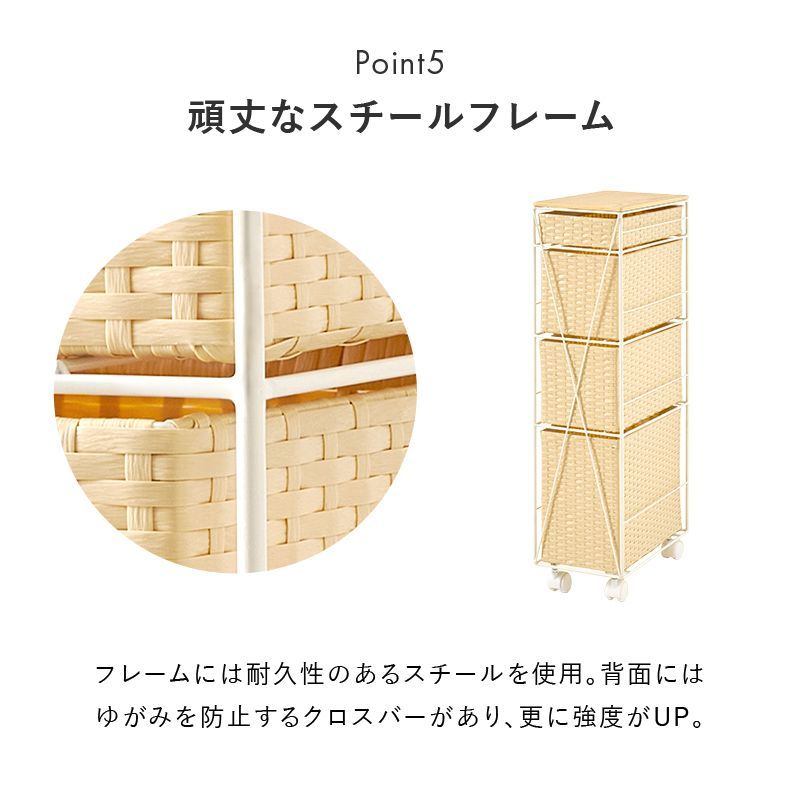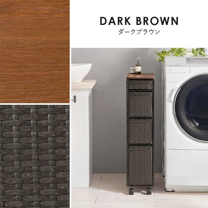 ランドリースペースやキッチンの隙間で使えるチェスト。樹脂素材を編んだ引出しは水や汚れに強く通気性も抜群。
