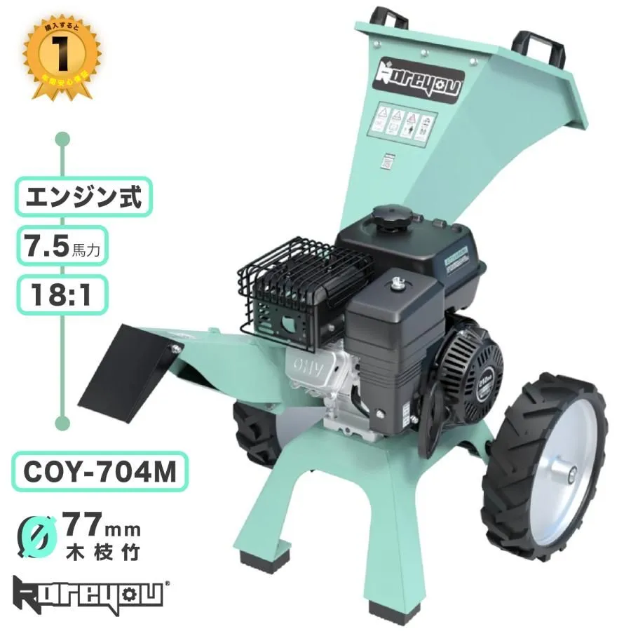 ■ 型番 COY-704M 定格出力 7.5馬力 空冷4サイクルエンジン 排気量 212cc 燃料 レギュラーガソリン 燃料タンク容量 3.6L エンジンオイル SAE 10W-30/API SJ/API SL エンジンオイル容量 0.6L 始動方式 リコイルスターター式 点火プラグ F7TC 粉砕能力 最大77mm 対応素材 木 / 枝 / 竹等々 乾燥重量 47kg 本体サイズ 1180*500*830mm 梱包サイズ 750*600*490mm