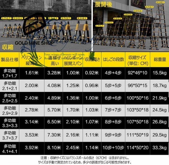 ● ご注意ください: 1. はしごを閉じるときは、ステップの間に手や手を置かないでください。 2. 手動測定による1?3cmのサイズ誤差のため、実際のサイズが優先されます。 3. 明るさによる画像と実際の要素の間には微妙な違いがあります。 4. はしごについてご質問がある場合は、まずお問い合わせください。喜んで対応させていただきます。素晴らしい人生を送れるよう願っております。 □支払詳細 ★入金確認後6-13営業日発送させていただきます。GOLD MINE SHOP転載禁止。 ★追跡番号は発送連絡と一緒に送らせていただいております。GOLD MINE SHOP転載禁止。 □注意事項 ★在庫切れ可能があります、商品変更か取引キャンセルか対応する場合がございますので、是非、その時ご理解とご容赦のほどよろしくお願いします。GOLD MINE SHOP転載禁止。 ★基本的に入札後、落札後のキャンセルはお受けいたしておりません。GOLD MINE SHOP転載禁止。 ★失礼しますが、商品や取引に関するなにか質問がございましたら、入札前にご提出いただければと存じます。ご不明な点があればお気軽にご質問等下さい。GOLD MINE SHOP転載禁止。 ★ 品質に極端なこだわりをお持ちの方、極端に神経質な方はご入札ご遠慮ください。GOLD MINE SHOP転載禁止。 ★ご不明な点がございましたら、ご入札前にご質問ください。 ★お客様のイメージ違いなどのご返品をお受付出来かねます。初期不良の場合、返品対応可能です。GOLD MINE SHOP転載禁止。 以上、ご了承いただいた上でご入札下さいますよう、お願い致します。 ここまでご覧いただき、ありがとうございました。 それでは、どうぞよろしくお願いいたします。 他にも多数出品しております。ご覧下さい。 GOLD MINE SHOP転載禁止。