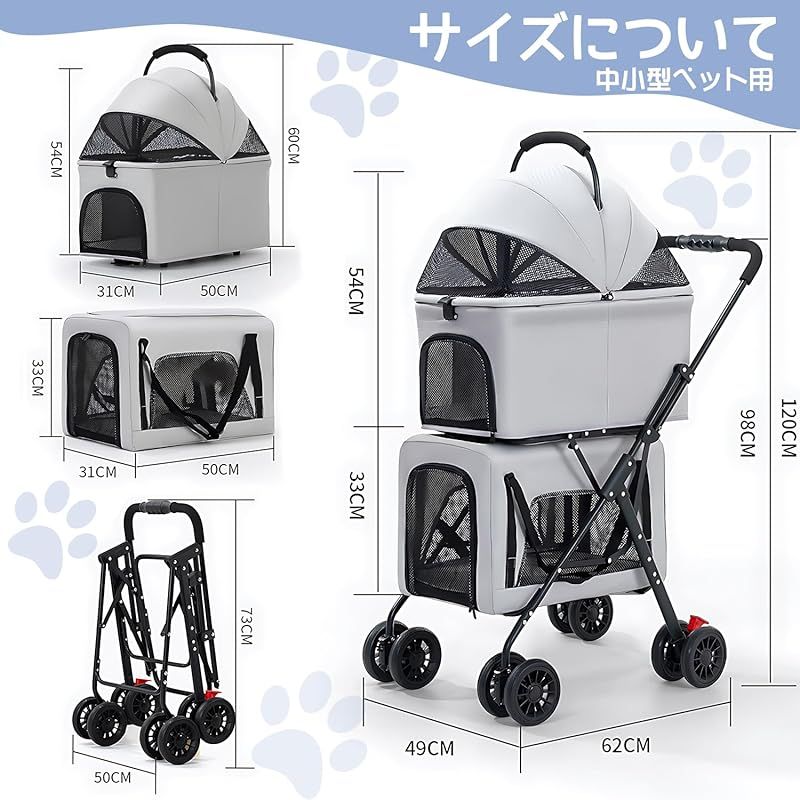 【商品説明】 ペットカート 分離型 多頭飼いに最適。 これは単なるペットカートではなく、スタイルと高品質を兼ね備えたショッピングカートです。 2層に分かれたユニークなデザインにより、上下のスペースをフルに活用できます。 上段の巧みにデザインされたペットキャリアは簡単に取り外すことができ、即座にカーボックスや簡易住居に変身し、ペットとの旅に無限の楽しみを加えます。 素材 フレーム:高強度アルミニウム合金 生地:カチオン生地 窓:ナイロンメッシュ タイヤ:EVAソリッドラバータイヤ 寸法 ペットキャリアの展開時寸法(約):幅49 cm × 奥行き62 cm × 高さ120 cm(フレームを含む全体として展開した場合) 折りたたみ時の厚さ:26 cm ペットスペース寸法(約)上段:幅55×奥行31×高さ54cm、下段:幅50×奥行31×高さ33cm(折りたたみ時の厚み:8cm) 重量(約)5.6kg 耐荷重(約) 上段15kg 下段 30kg