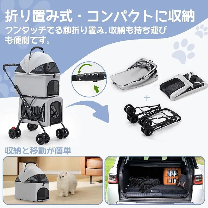 OXSITO ペットカート 2段式 分離型 多頭飼い対応 軽量 折りたたみ式 犬用カート 上段10KG 下段15KG 大容量 多機能 組み立て簡単 犬バギー コンパクト設計 通気性メッシュ 中型犬 小型犬 猫対応 ポケット付き 前後出入り可能 お出かけ 旅 1