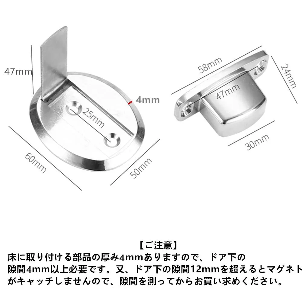 【ご注意】床に取り付ける部品の厚み4mmありますので、ドア下の隙間4mm以上必要です。又、ドア下の隙間12mmを超えるとマグネトがキャッチしませんので、隙間を測ってからお買い求めください。