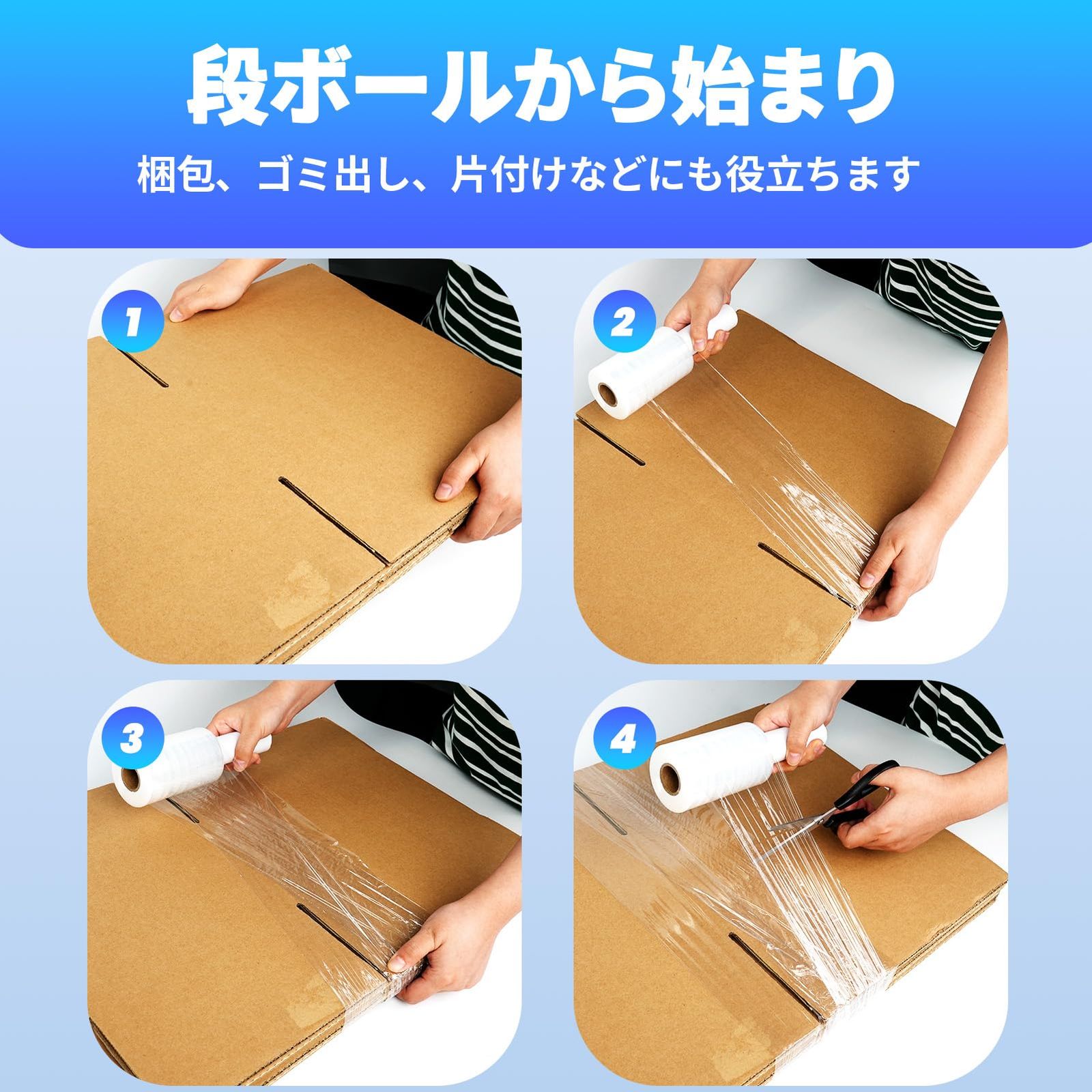 150m分の長さがありますので1回のお引越しにも充分な長さを備えています。交換用ラップもセットしており、長くお使いいただけます。