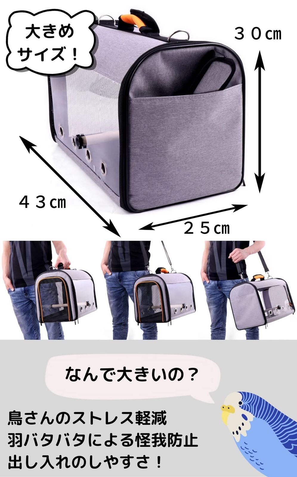 【エサ、水入れ付き】長時間の移動に対応。屋根がついているので電車で移動でも目立ち過ぎません 内容:キャリーバッグ30×25×43、ショルダーストラップ、止まり木、エサ入れ ※透明窓には両面に保護フィルムが貼ってあります。制作時や輸送時の傷防止の為貼らせて頂いております。剥がしづらい場合がありお手数お掛け致します。 色 グレー×オレンジ ブランド VEROMAN 商品の寸法 43長さ x 25幅 x 30高さ cm 特徴 フォルダブル サイズ 43L x 25W x 30H cm