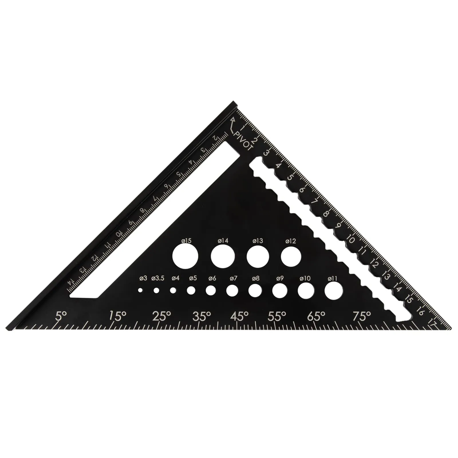 18cm以内の長さ測定のほか、直線、角度や丸形も描けます。直径3mmから15mmまで14個の穴があり、穴あけるとき、ドリルガイドとしても使用可能です。