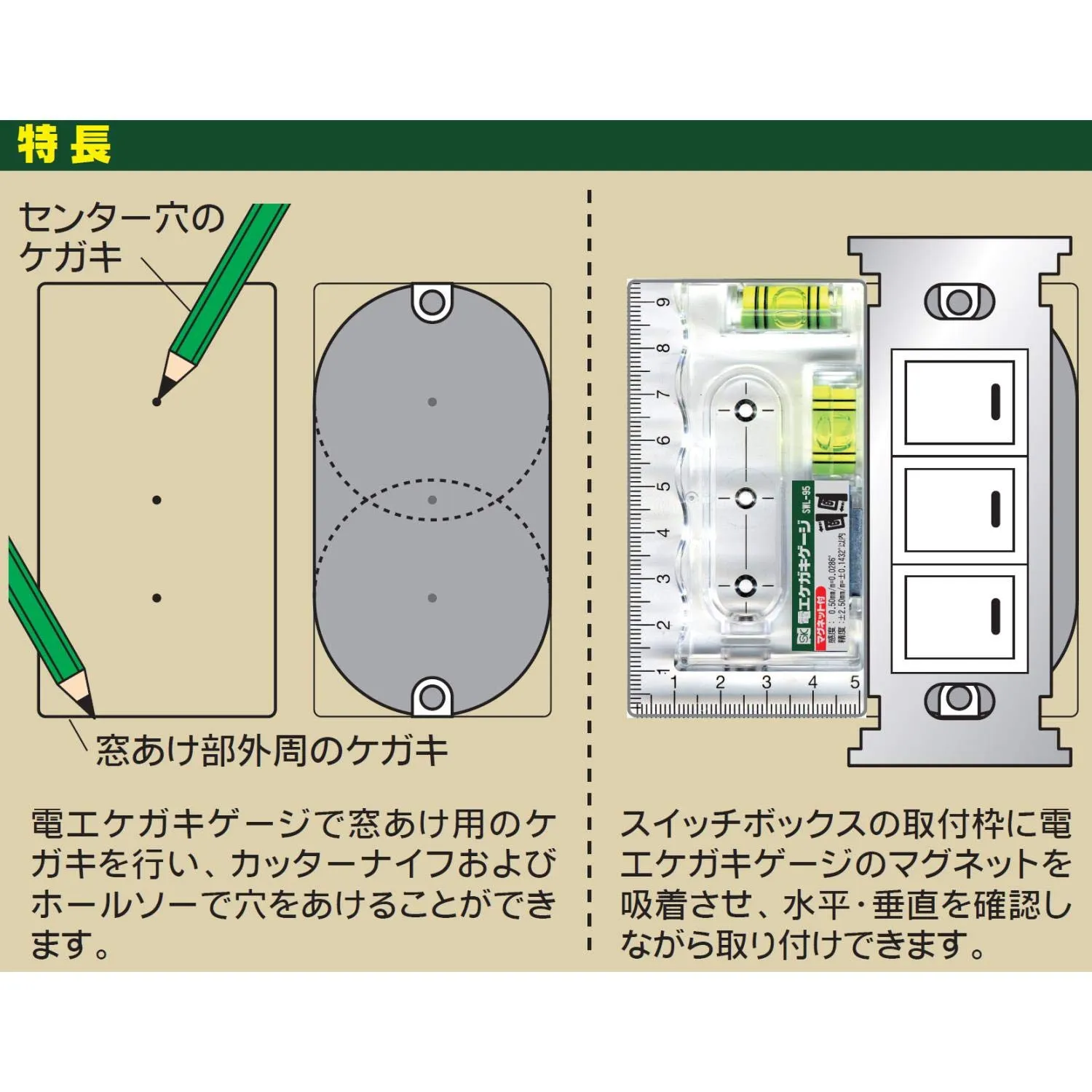 用途:埋込式スイッチボックスやコンセントの取付時、窓あけ用のケガキ作業や水平、垂直の測定に