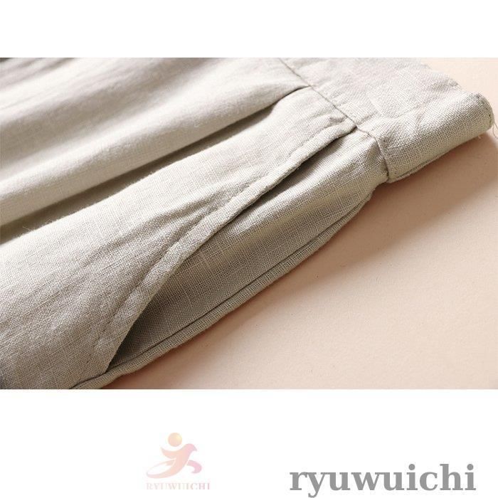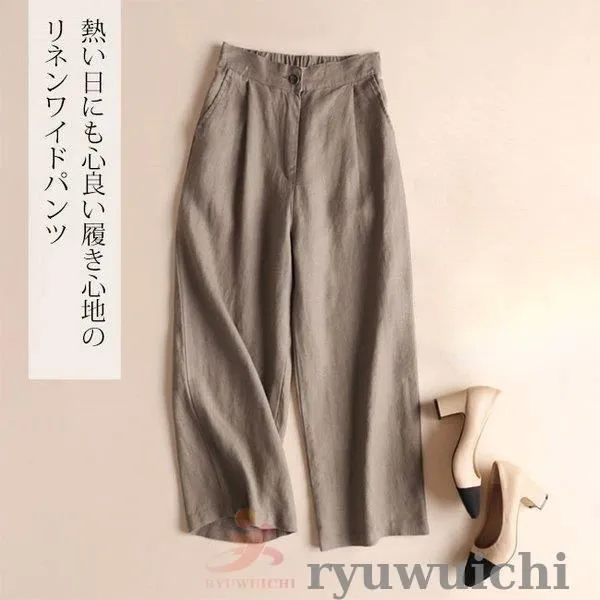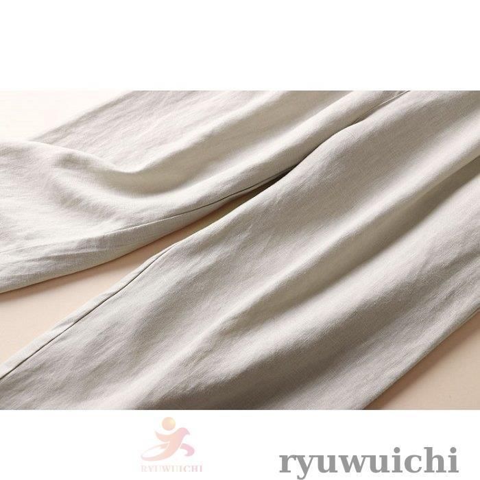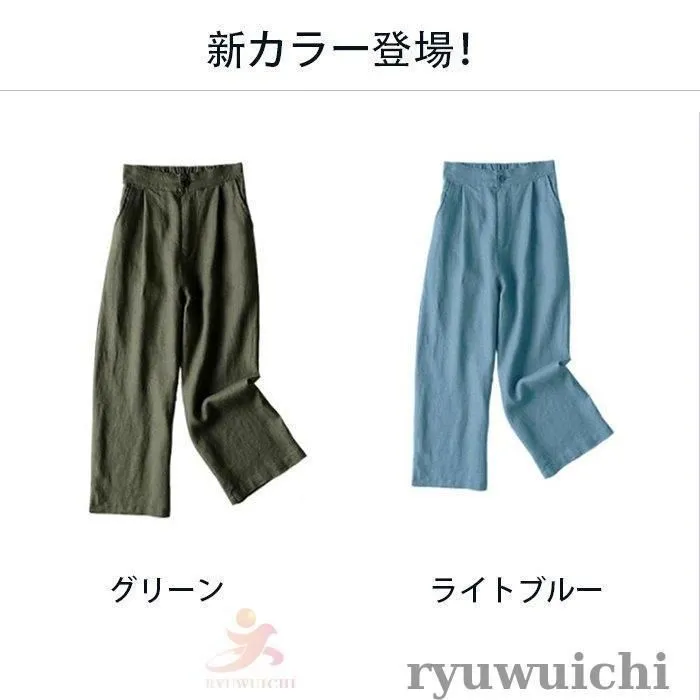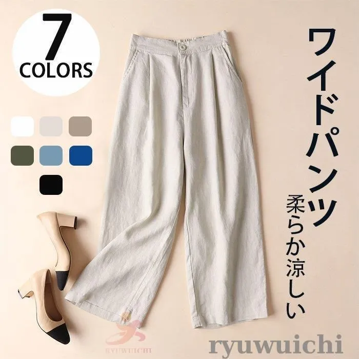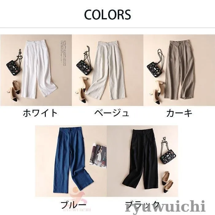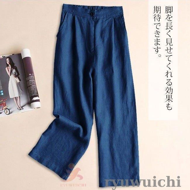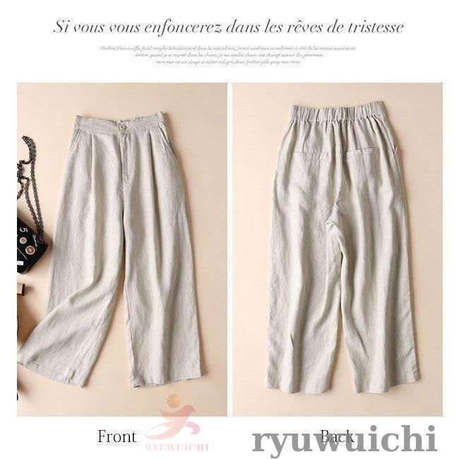 ワイドパンツ レディース ウエストゴム ゆったり ボトムス 薄手 体型カバー 亜麻 麻混 八分丈 九分丈 ガウチョパンツ ズボン 春夏秋
