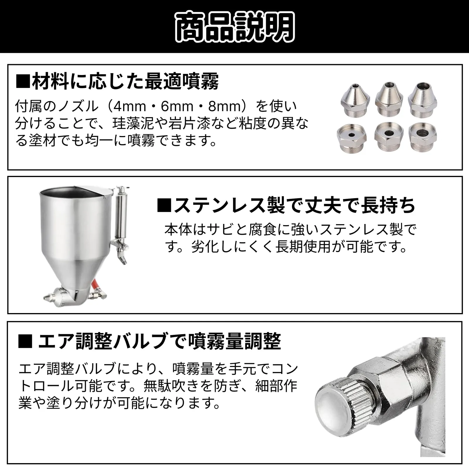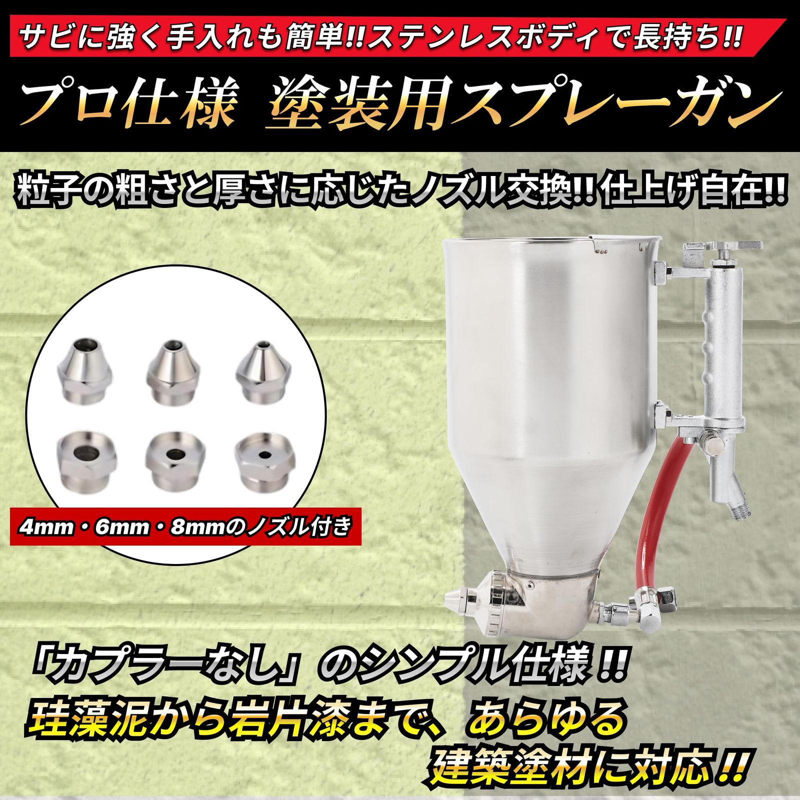 【特徴】 ・マルチ対応:リシン、スタッコ、タイルなど、建築塗装の幅広い用途に対応 ・重力式カップ(3.5L):上部装着タイプで最後までムダなく塗料の使用が可能 ・大口径カップ開口部:塗料注入時のこぼれを防止 ・6種類のノズル付属: 塗料用ノズル:φ4/6/8mm、空気用ノズル:φ4/6/8mm。簡単付け替えで用途に応じた吹き分けが自在! ・シンプル仕様(カプラーなし):接続口はPT1/4(外ネジ)規格、 お手持ちのエアーカプラーや配管設備に合わせて自由に選択・取り付け可能