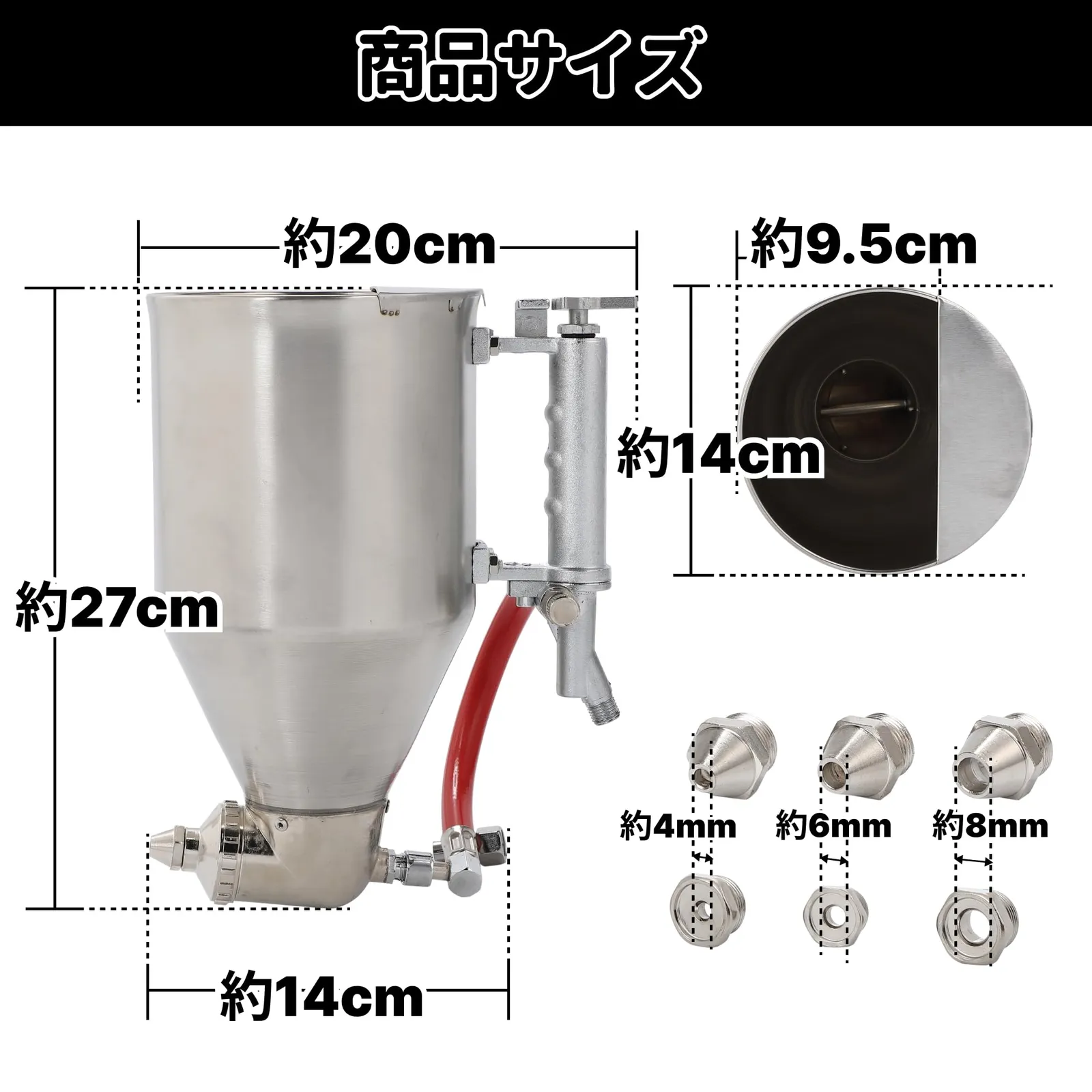 【商品内容】 ・本体 ×1 ・カップ(3.5L)×1 ・塗料ノズル(φ4/6/8mm)×各1 ・空気ノズル(φ4/6/8mm)×各1 ※エアーカプラーおよびエアーコンプレッサーは付属しておりません。