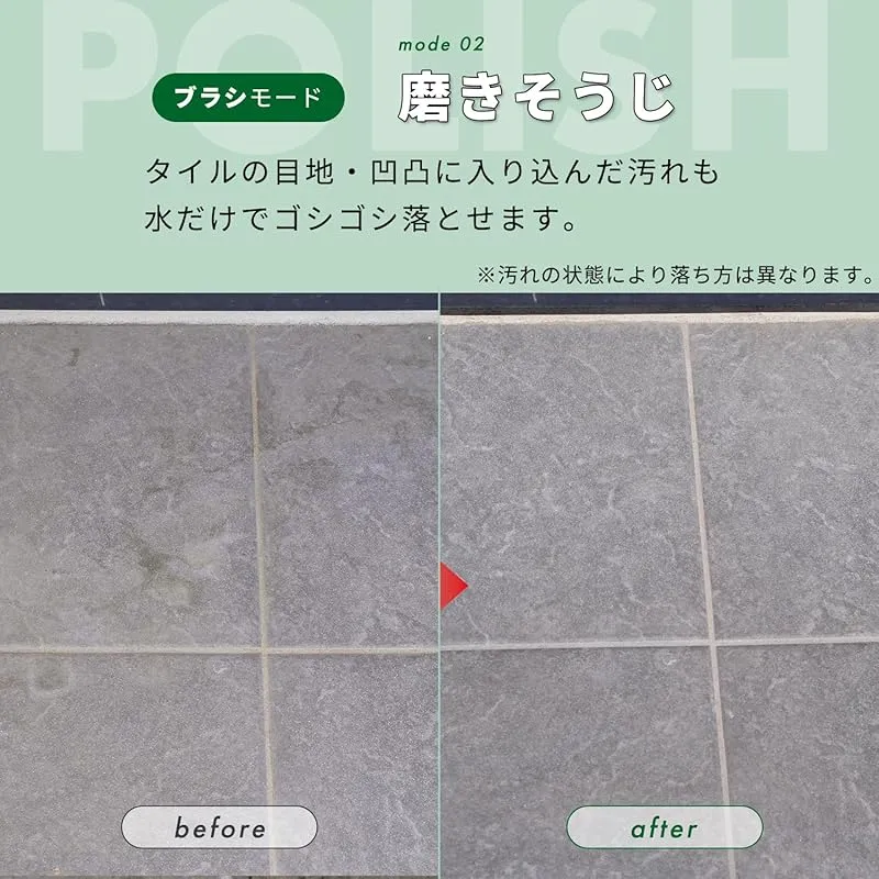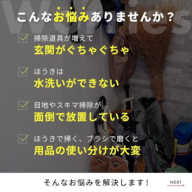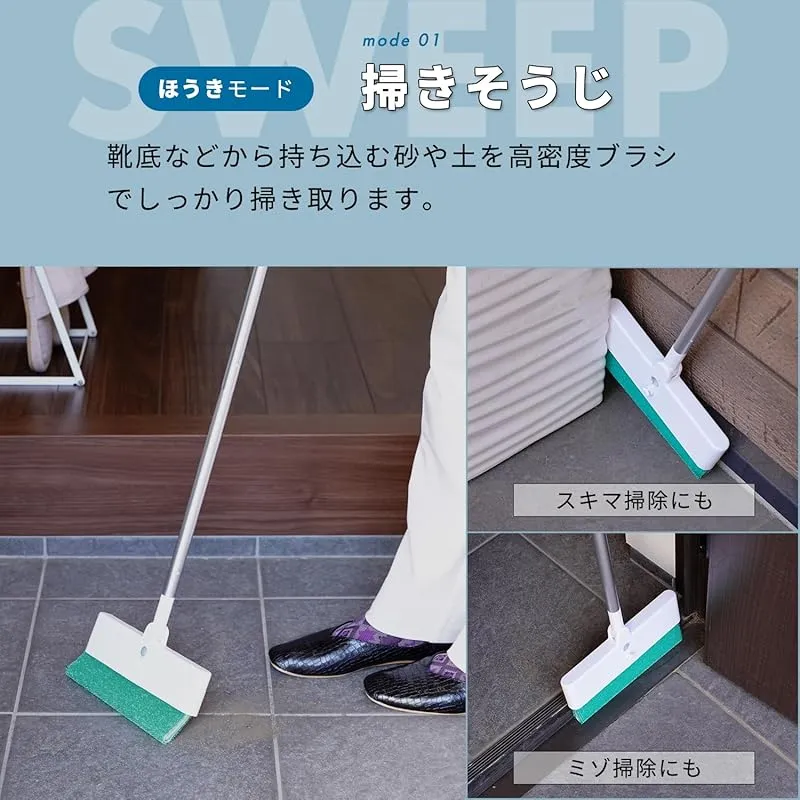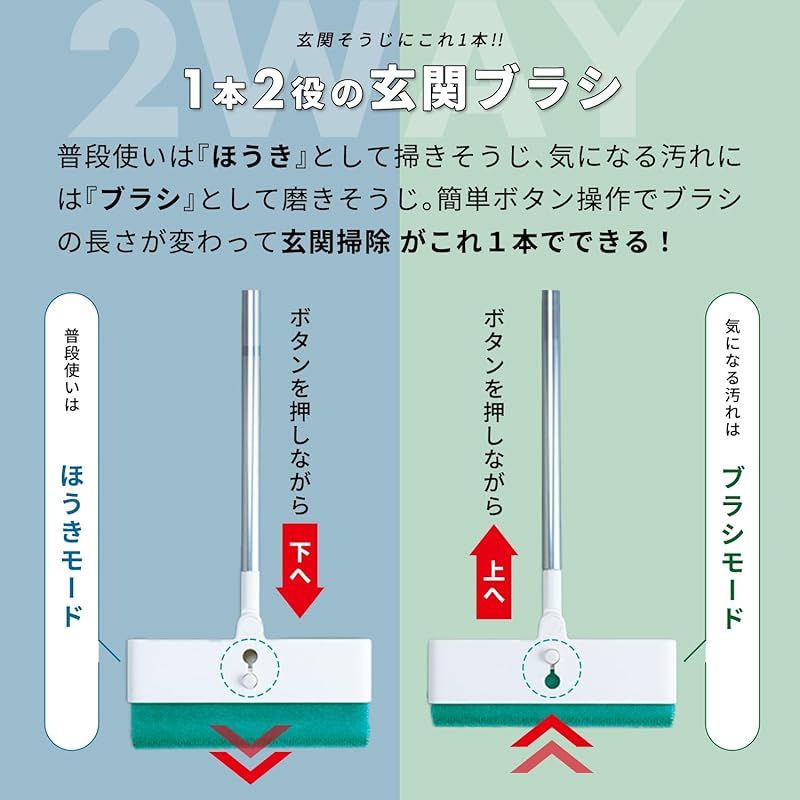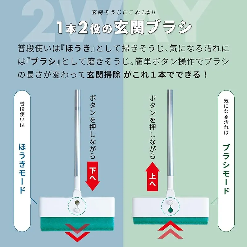 【商品概要】 1本2役!ブラシの長さを変えることで玄関の掃き掃除とタイル・目地の磨き掃除ができます。 ブラシを長く出した状態は玄関まわりの掃き掃除に便利です。ほうきの様にしならせて掃くことができます。 ブラシを短く出した状態は玄関タイルの凹凸や目地の磨き掃除に便利です。 密集したブラシ繊維が玄関タイルの凹凸に入り込み細かい汚れをしっかりかき取ります。 便利な自立式収納ケース付きで玄関の隅や靴箱にもすっきり収まる省スペース設計です。
