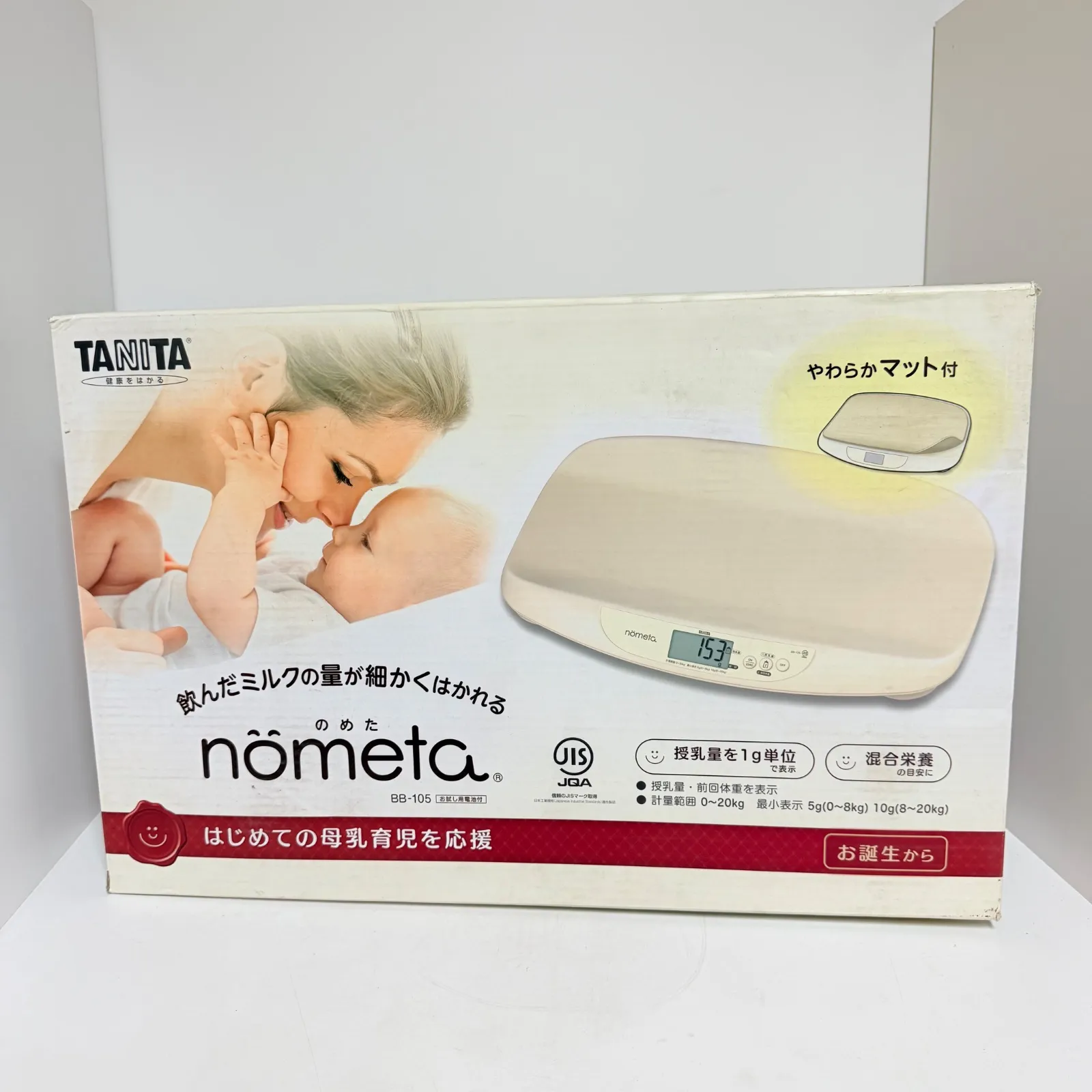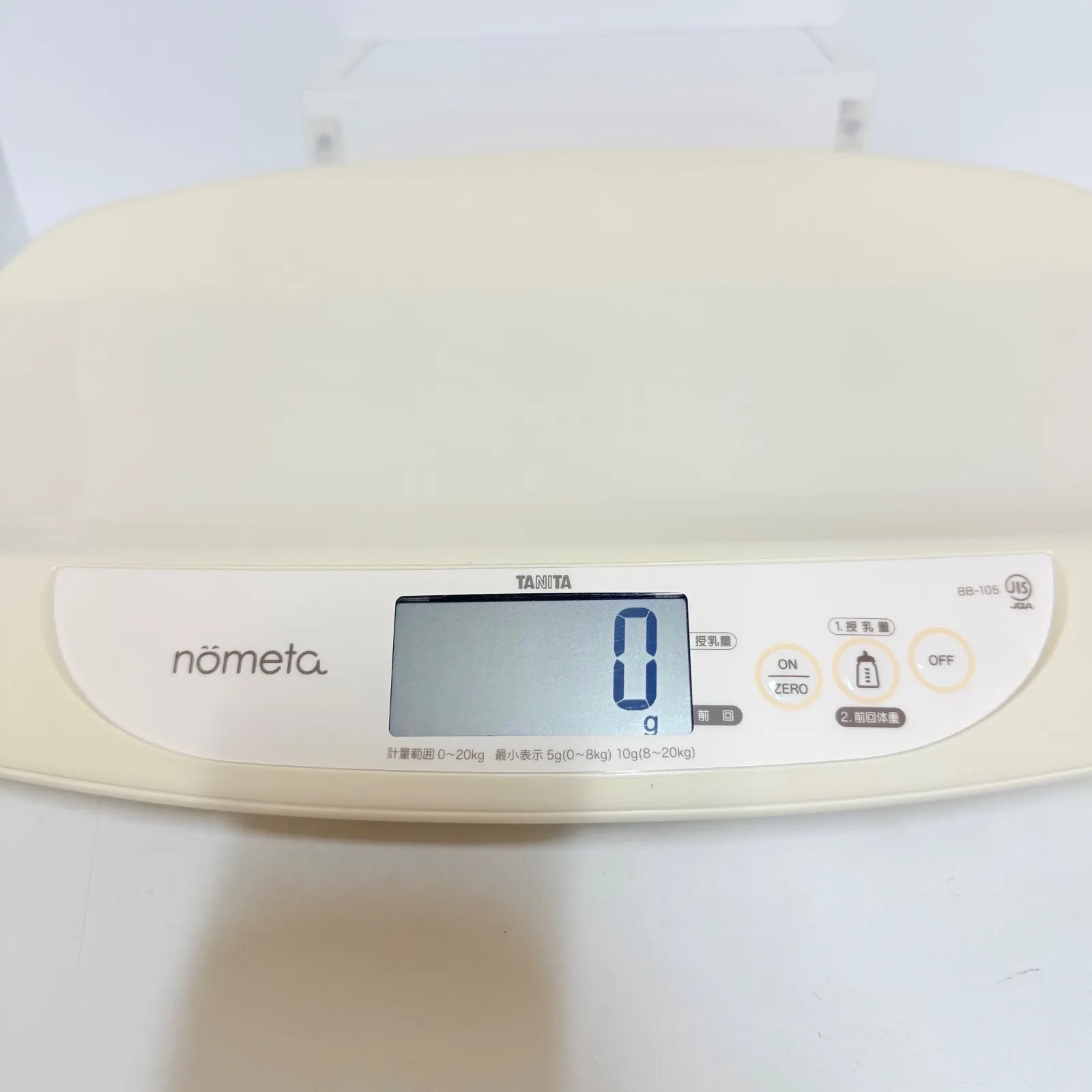 タニタのベビースケール「nometa(のめた) BB-105」になります。こちらは赤ちゃんの体重変化を細かく測定できる人気モデルで、新生児期から使用できる高精度タイプです。