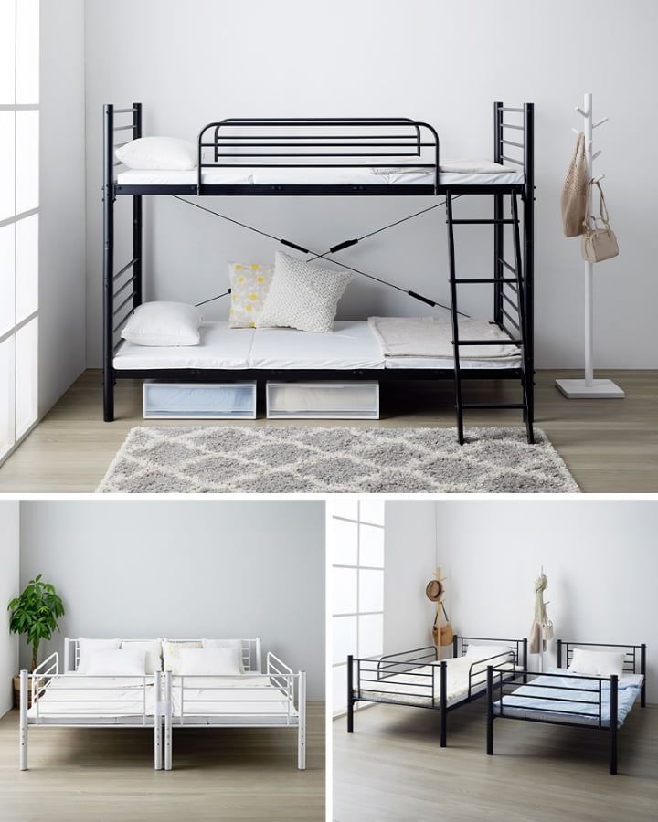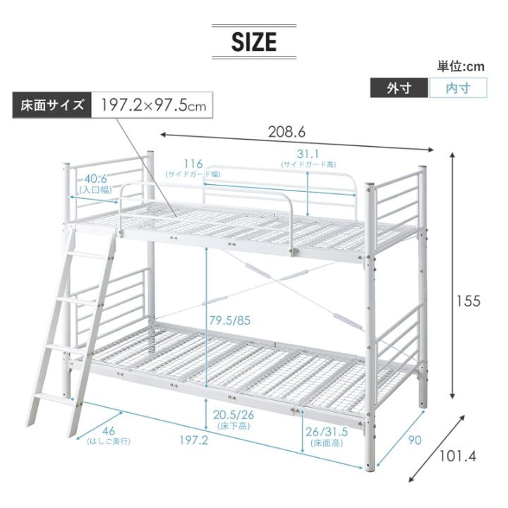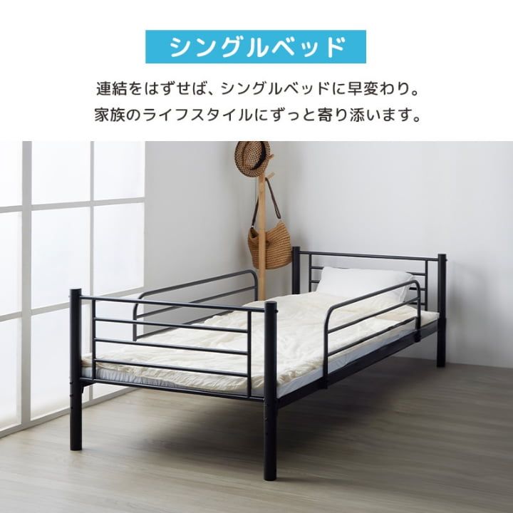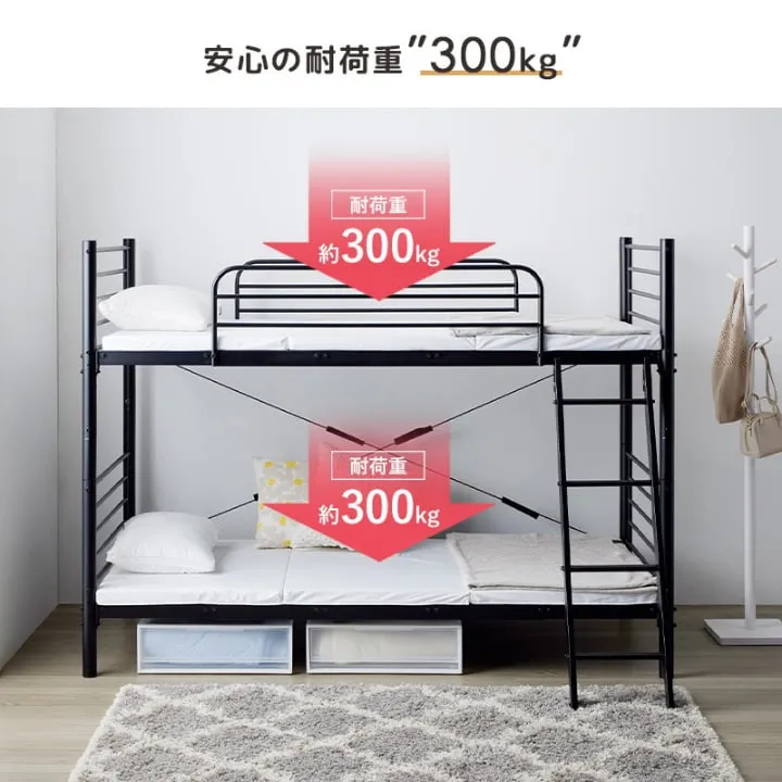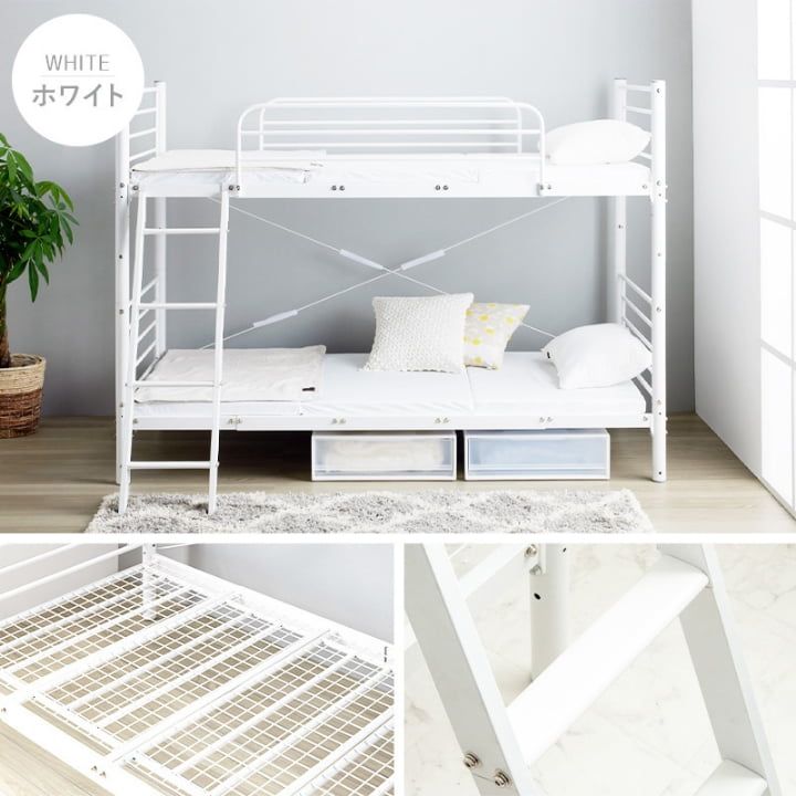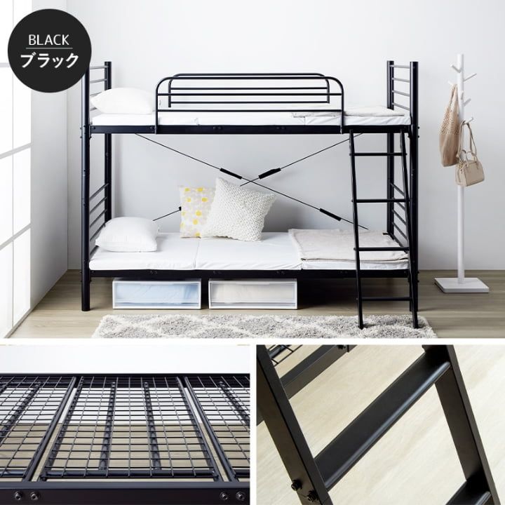■日時指定について 商品ページ内で日時指定不可という記載がある場合を除き、 お届け時間帯やお日にちのご希望承ります。 日にちはお支払い日より7日以降から承らせていただきます。 商品説明(スペック) 分割しても使える頑丈で安心の二段ベッド 配達業者を指定いただくことはできません。 沖縄/離島のお届けに別途中継料金が発生します。 ※該当地域の方はご注文前にお問い合わせください。 シンプルなデザインが、どんなお部屋にも合う二段ベッドです。大人でも安心して使用できる、各段の耐荷重は300kg。上下分割が可能で、それぞれがシングルベッドとして、連結すればキングベッドとしても使用できます。大人、子供、学生寮など、幅広い年齢層やシーンに対応可能です。 タイミングによっては在庫切れの場合があります。 商品詳細 生産地 中国 サイズ [2段ベッド使用時] 本体:幅101.4×奥行208.6×高さ155cm 床面サイズ:97.5×197.2cm 床面高さ:26(20.5)/31.5(26)cm ※高さ2段階調節可/()内は床下有効内寸 [キングベッド使用時] 本体:幅205.3×奥行208.6×高さ70.5cm 床面サイズ:194.5×197.2cm [シングルベッド使用時] 本体:幅101.4×奥行208.6×高さ70.5cm 素材 本体:スチール、粉体塗装 注意事項 こちらの商品は2梱包でお届けします。 沖縄・離島は別途送料お見積りいたします。ご注文前にお問い合わせください 仕様 カラー:ブラック / ホワイト 本体重量:約71kg 耐荷重:床面約300kg 床面高さ2段階調整可 通気性抜群のメッシュ床板 フレームの強度を高めた揺れの少ない頑丈設計 床板のすき間を狭くし安全面に配慮 梱包サイズ1:118×40×20cm/約45kg 梱包サイズ2:98×39×27cm/約30kg お客様組み立て品(組立目安時間:2人約100分)
