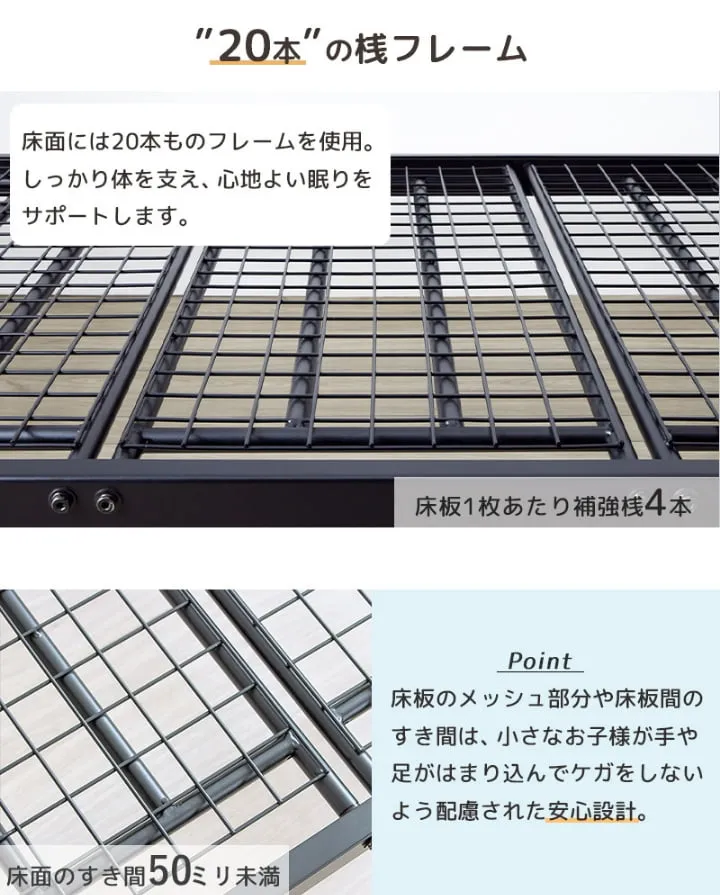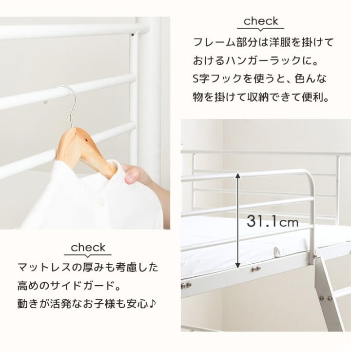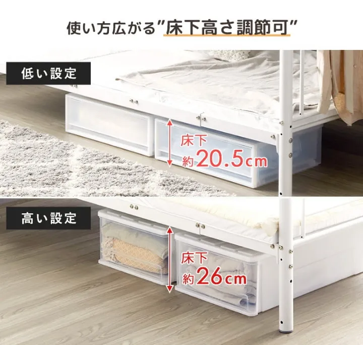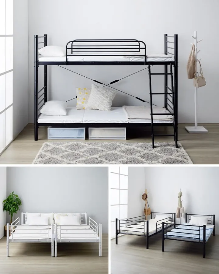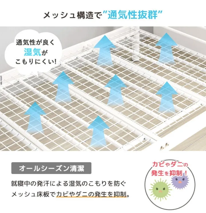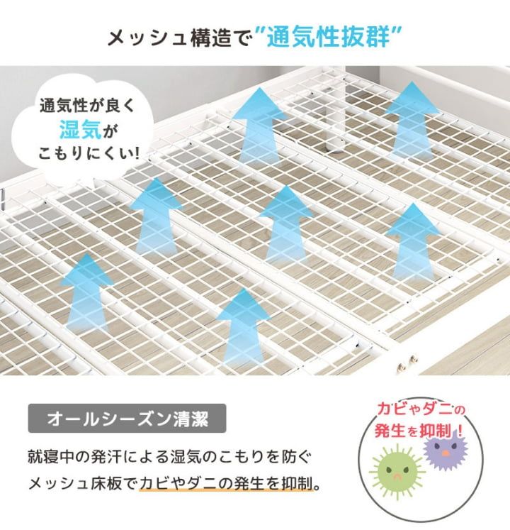 ■日時指定について 商品ページ内で日時指定不可という記載がある場合を除き、 お届け時間帯やお日にちのご希望承ります。 日にちはお支払い日より7日以降から承らせていただきます。 商品説明(スペック) 分割しても使える頑丈で安心の二段ベッド 配達業者を指定いただくことはできません。 沖縄/離島のお届けに別途中継料金が発生します。 ※該当地域の方はご注文前にお問い合わせください。 シンプルなデザインが、どんなお部屋にも合う二段ベッドです。大人でも安心して使用できる、各段の耐荷重は300kg。上下分割が可能で、それぞれがシングルベッドとして、連結すればキングベッドとしても使用できます。大人、子供、学生寮など、幅広い年齢層やシーンに対応可能です。 タイミングによっては在庫切れの場合があります。 商品詳細 生産地 中国 サイズ [2段ベッド使用時] 本体:幅101.4×奥行208.6×高さ155cm 床面サイズ:97.5×197.2cm 床面高さ:26(20.5)/31.5(26)cm ※高さ2段階調節可/()内は床下有効内寸 [キングベッド使用時] 本体:幅205.3×奥行208.6×高さ70.5cm 床面サイズ:194.5×197.2cm [シングルベッド使用時] 本体:幅101.4×奥行208.6×高さ70.5cm 素材 本体:スチール、粉体塗装 注意事項 こちらの商品は2梱包でお届けします。 沖縄・離島は別途送料お見積りいたします。ご注文前にお問い合わせください 仕様 カラー:ブラック / ホワイト 本体重量:約71kg 耐荷重:床面約300kg 床面高さ2段階調整可 通気性抜群のメッシュ床板 フレームの強度を高めた揺れの少ない頑丈設計 床板のすき間を狭くし安全面に配慮 梱包サイズ1:118×40×20cm/約45kg 梱包サイズ2:98×39×27cm/約30kg お客様組み立て品(組立目安時間:2人約100分)