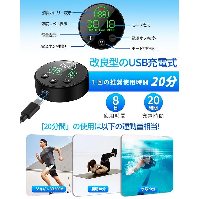 【進化型15モード&30強度を自由選択】 15種類の豊富なトレーニングモードと、30段階のきめ細かい強度調節を搭載。初心者は軽めの刺激からスタートし、上級者は本格的な筋トレ並みの強度まで調整可能。自分の体力や目的に合わせて、最適なトレーニングが選べます。たった20分の使用で、1600mのランニングや40分間の水泳、または筋力トレーニングと同等の効果を実感でき、忙しい方にもぴったりです。
