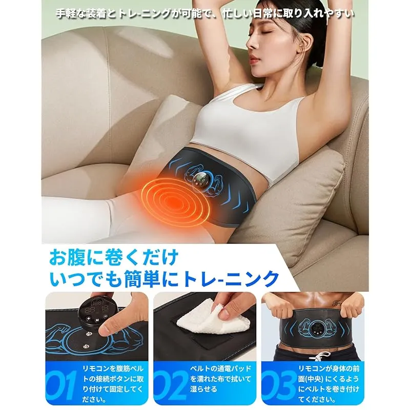 【12枚伝導腹筋パッド・商品内容】伝導パット部分は水拭きで清掃できます。寿命が長いです。ベルト部分は腹に巻き付けて固定するだけで、使いやすく、水洗いが可能です。腹部ベルト*1+コントローラー*1+USB充電ケーブル*1+日本語説明書*1。