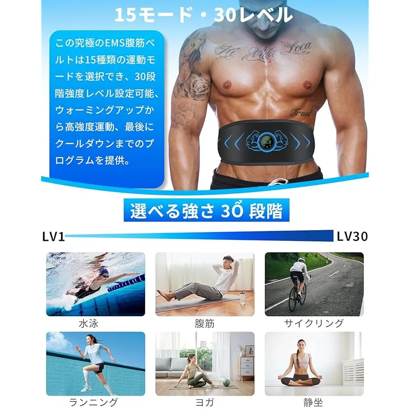 【腹筋ベルトには15モード・30段階強度を選択】この腹筋ベルトは人体の構造に合致しています。豊富なモードと強度の段階が備わっており、ウォーミングアップから高強度運動、最後にクールダウンまでのプログラムを提供します。モードと強度を巧妙に組み合わせることで、EMS微電流刺激を与え、深部筋肉を効果的に鍛えることができます。