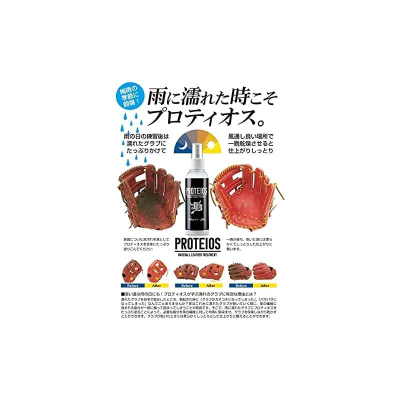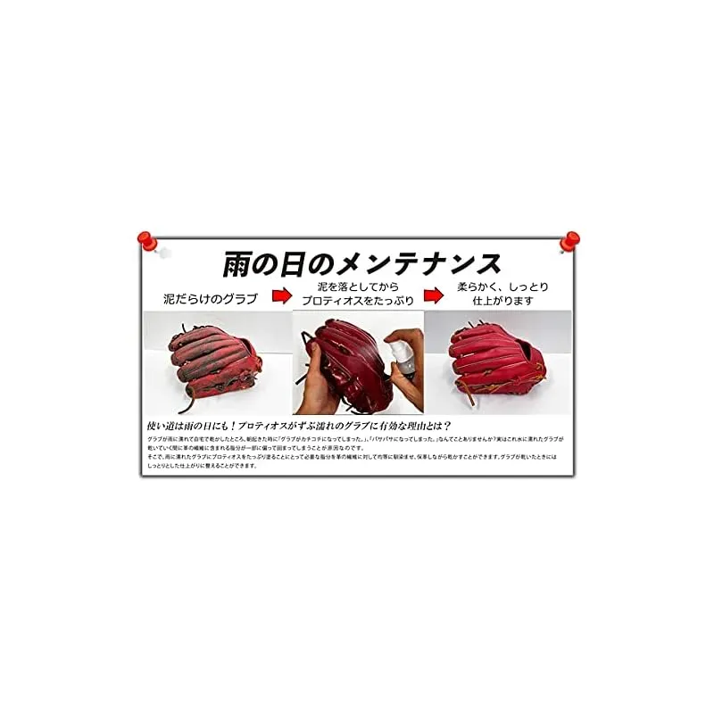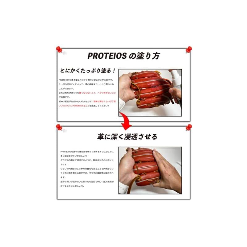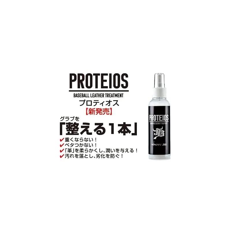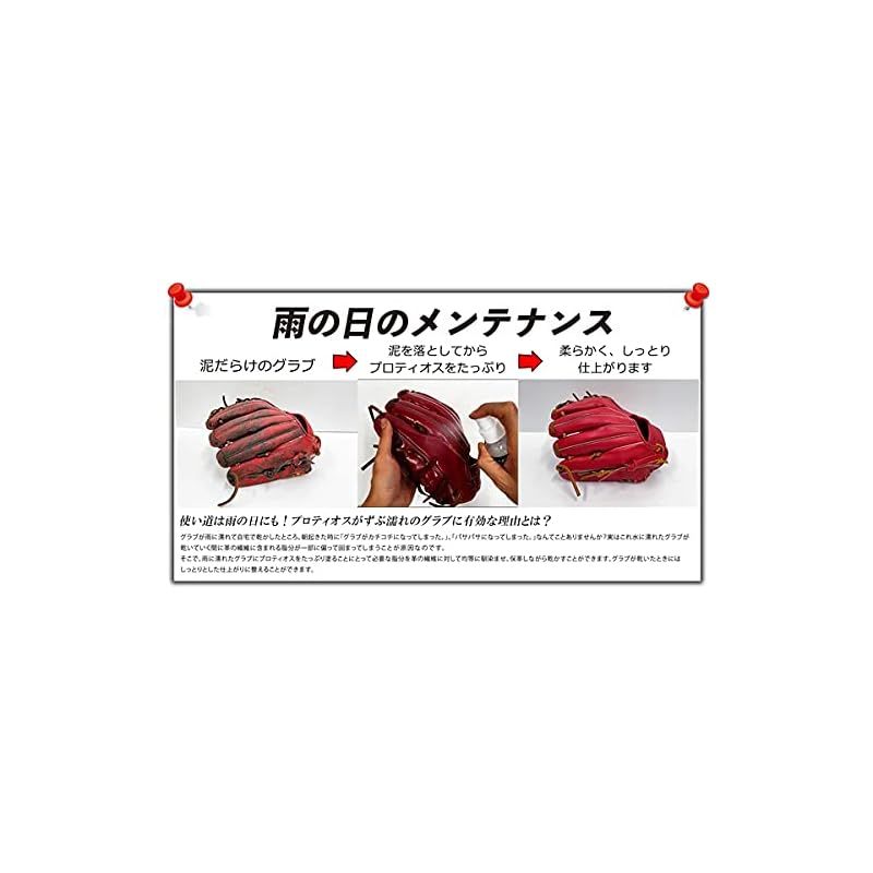 【商品説明】 プロティオスはグラブ用液体トリートメントです。 革への浸透性が非常に高いため革の繊維質にその成分が浸透し保湿性が高められ、柔らかさや潤いを優れたものにします。 さらに、革の表面が保護されることで、浸透したメンテナンス剤の揮発が抑制され、長時間革の良い状態が維持されます。 また、グラブのベタつきを抑え、汚れを除去し、劣化を防ぐ効果も得られます。 商品説明 PROTEIOS(プロティオス) グラブトリートメント 150ml スプレーボトル