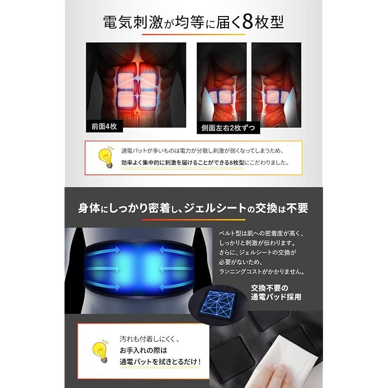【8枚のパッドが効率よく筋肉にアプローチ】 腹直筋以外に腹斜筋にも集中的に刺激を届けれるよう、前面に4枚、側面左右2枚ずつの8枚型にこだわりました。 ?