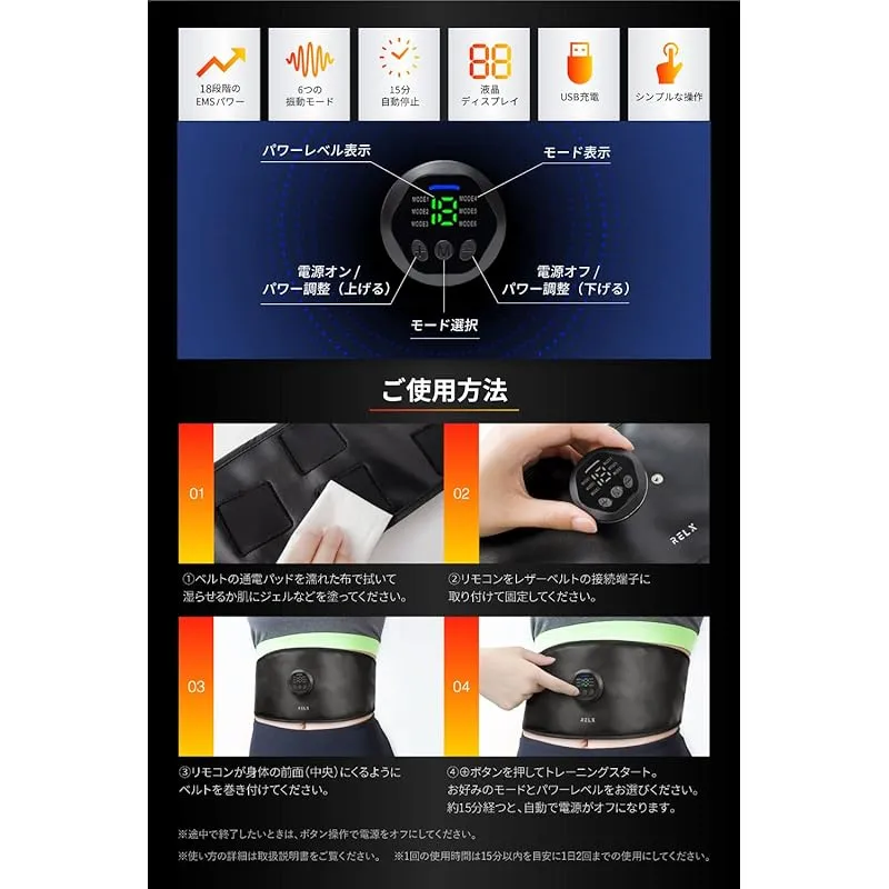 【使用方法】 1回の使用時間は15分以内を目安に1日2回までの使用にしてください。 ベルトの装着部位にジェル等を肌につけ、リモコンをレザーベルトの接続端子に取り付けて固定してください。 ※使用部位には必ず水や化粧水等で湿らせてからご使用ください。※乾いた肌に使用すると強い刺激や痛みを感じるおそれがあります。 リモコンが身体の全面(中央)にくるようにベルトを巻き付け、電源(+)ボタンを押してトレーニングスタート Mボタンでお好みのMODE、+、-でお好みのパワーレベルをお選びください。 ※不快感や痛みを感じない程度のレベルでご使用下さい。 ※初めて使用する際は慣れるまでEMSのパワーはレベル1で短時間から開始してください。 約15分経つと、自動で電源がオフになります。途中で終了したいときは、-を押して電源をオフにして身体から取りはずしてください。充電時には定格電源DC5V-2Aのものをご使用ください。※急速充電器には対応しておりません。 ?