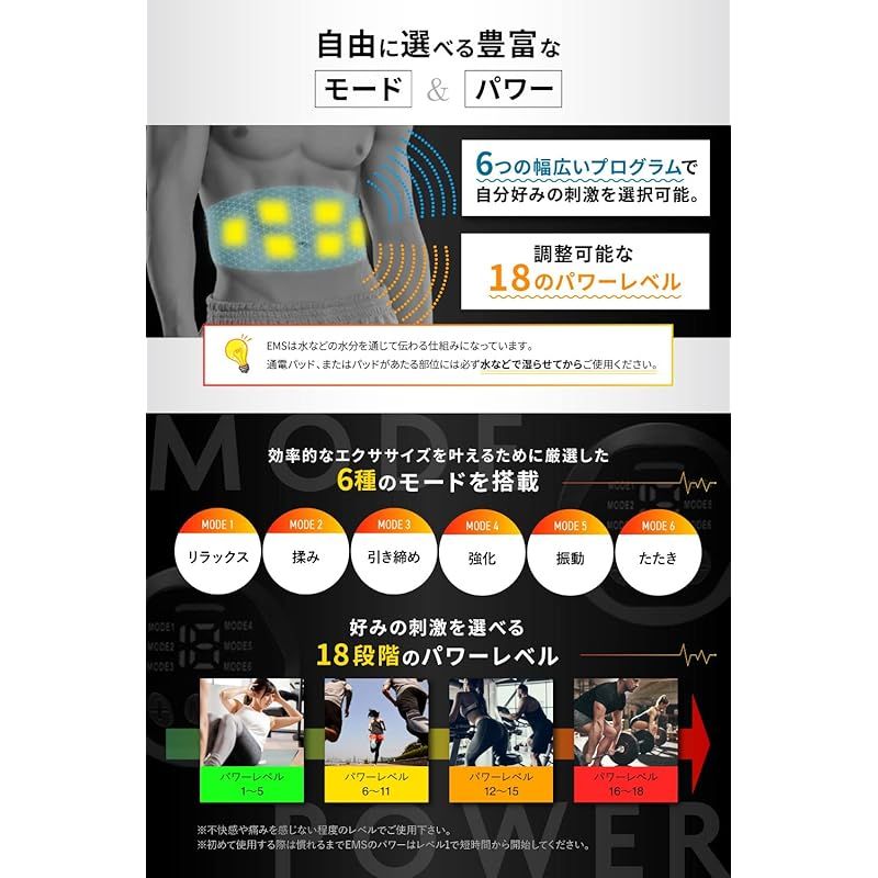 【選べるモードと強度で腹筋を強化】 トレーニングとクールダウンが組み合わさった6種のモードは「振動」「揉み」「強化」などの再現を目指し、18段階の幅広いパワーレベルは刺激レベルの上がり方も緩やかで、自分好みのレベルをお選びいただくことができます。15分の自動電源OFF機能搭載。※不快感や痛みを感じない程度のレベルでご使用ください。※初めて使用する際は慣れるまでEMSのパワーはレベル1で短時間から開始してください。 ?
