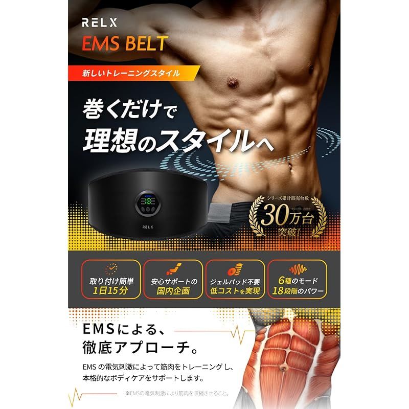 【商品説明】 (ジェルシート不要) RELX EMSベルト 腹筋ベルト (日本企業企画) 8枚の電極パッド 6種類モード 18段階強度 腹筋 腹筋マシーン トレーニング USB充電式 簡単操作 男女兼用 プレゼント ギフト