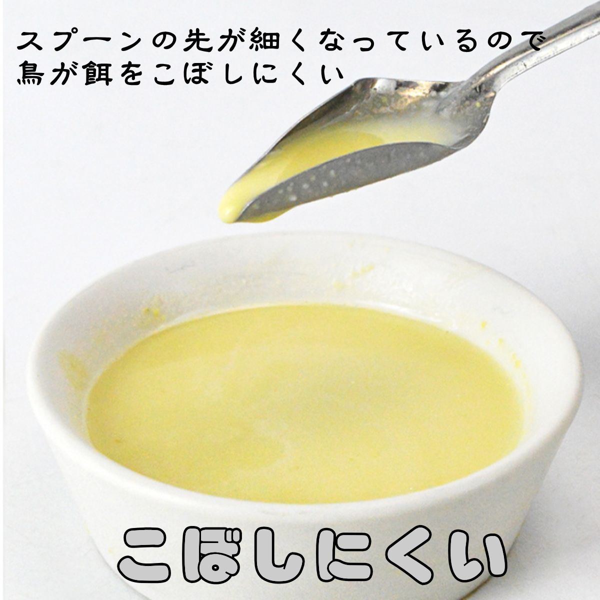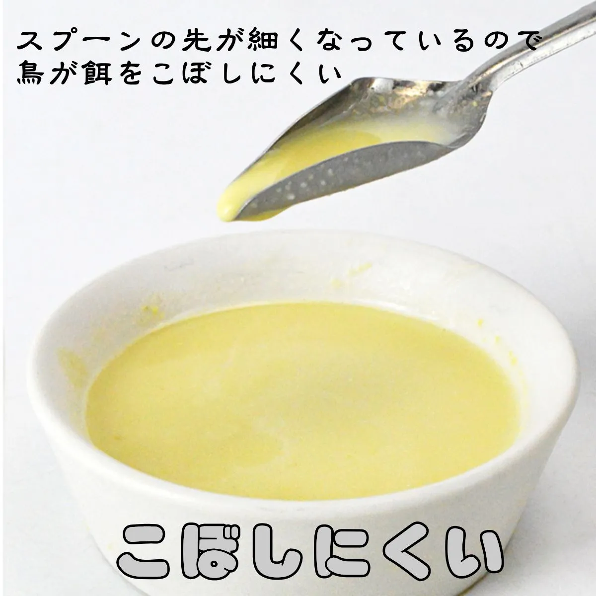 特にデザインされた細長いスプーンの先端は、鳥が餌をこぼしにくくするために工夫されています。