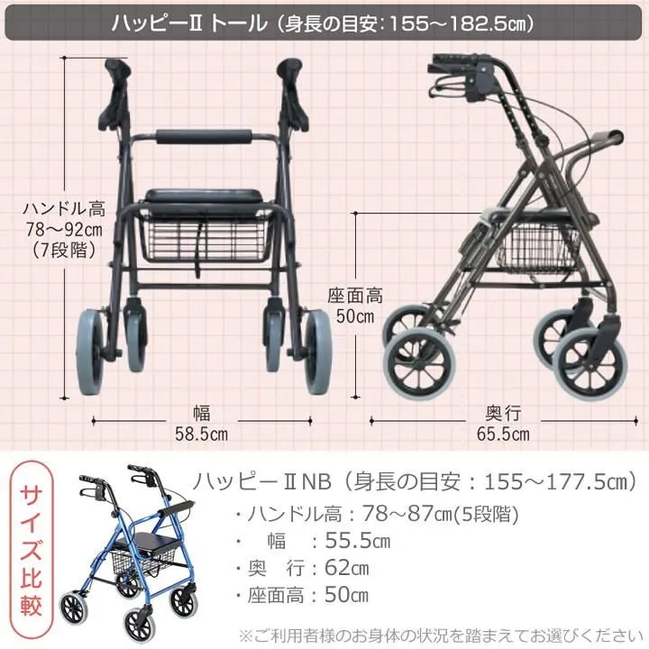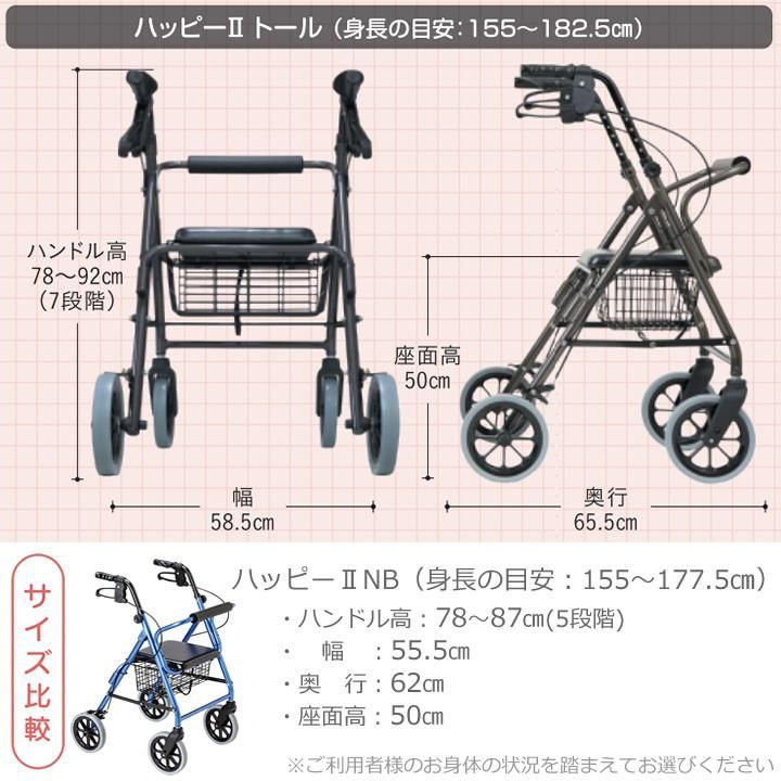 【シルバーカート シニアカート 歩行器タイプ】 座面付きで座れるシルバーカートです(イス付き) スタンダードタイプのハッピーIIに高さを5cmプラス より身長の高い方にもご利用いただけるようになりました