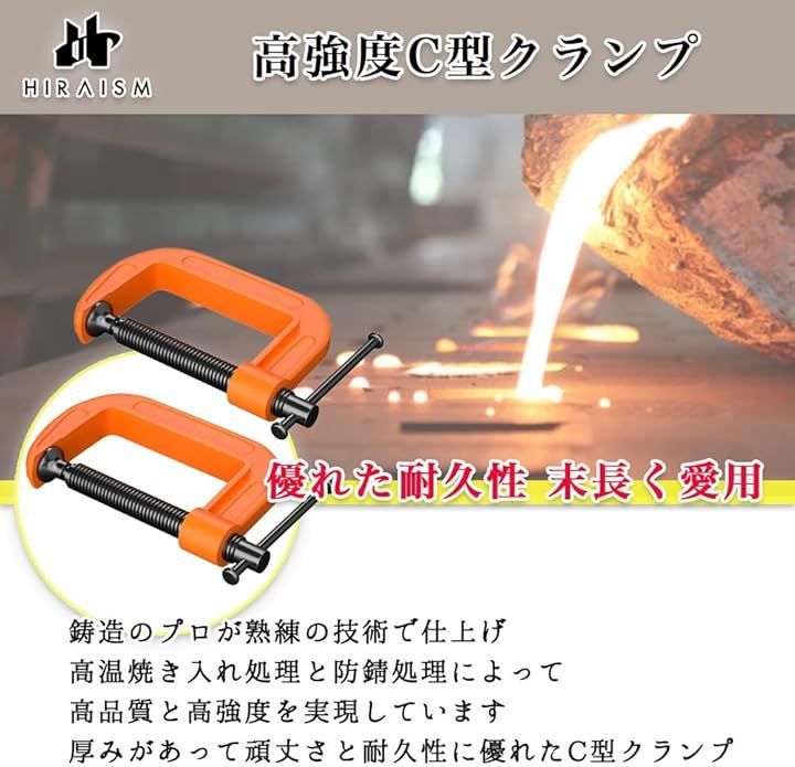 「高強度C型クランプ」HIRAISMのCクランプ(シャコ万力)は、鋳造のプロが熟練の技術で仕上げ、高温焼き入れ処理と防錆処理によって、高品質と高強度を実現しています。