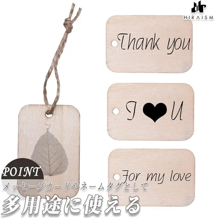麻ひも付きでシンプルでナチュラルなデザインが特徴で、木製の素材感が温かみのある雰囲気を演出し、さまざまな用途に使いやすいです。