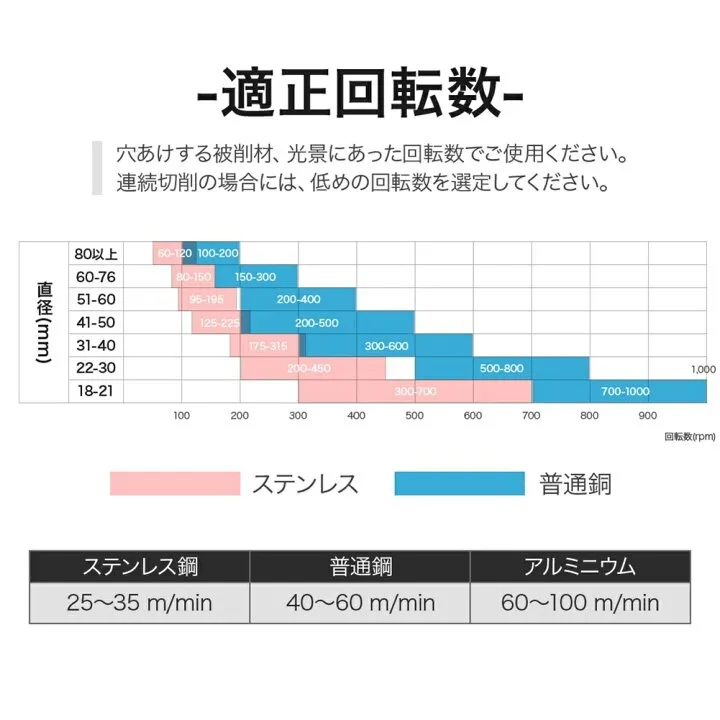【注意事項】部材に対し垂直利用、金属材切削時は切油利用、切削は低速回転スタートでお使いください。(詳しい回転速度は図を参考にしてください。) こちらの商品は、新品未使用になります。ご理解のある方のみご購入下さい。 上AB-24