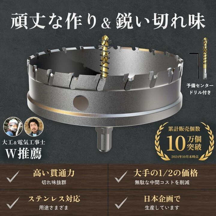 ●トップ写真と実物写真が微妙に違う事がありますので、購入の際は必ず実物写真をご確認の上ご購入お願いします。 分からない事がありましたらコメント下さい。 電動ドリル及びボール盤使用可能!優れた切れ味と耐摩耗性を持った超硬チップを備えたホールソーです! バイメタルホルソーより強力で使いやすいロングホールカッターです。